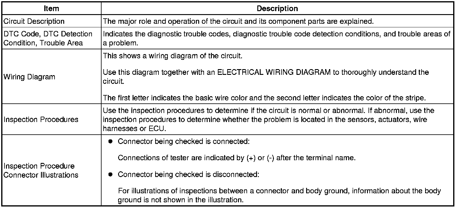 Look for output Diagnostic Trouble Codes (DTCs) (from the DTC checks) in the appropriate section's Diagnostic Trouble Code Chart. Use the chart to determine the trouble area and the proper inspection procedure. A description of each of the chart's columns is below.