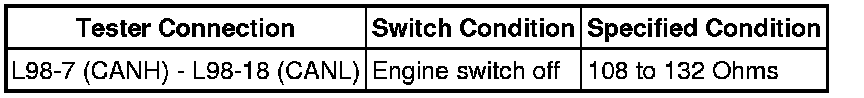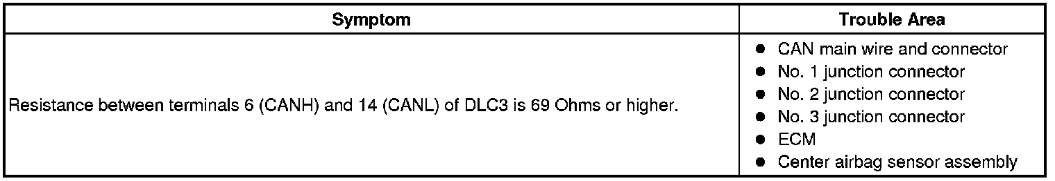 There may be an open circuit in the CAN main wire and/or the DLC3 branch wire when the resistance between terminals 6 (CANH) and 14 (CANL) of the DLC3 is 69 Ohms or higher.