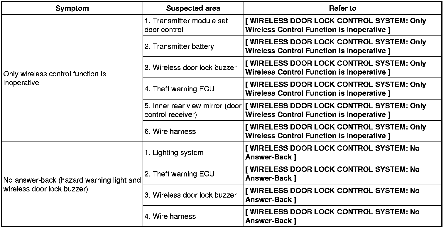 DOOR LOCK: WIRELESS DOOR LOCK CONTROL SYSTEM: PROBLEM SYMPTOMS TABLE