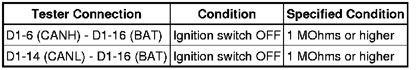 When any DTC for the CAN communication system is output, first measure the resistance between the terminals of the DLC3 to specify the trouble area, and check that there is no short in the CAN main bus line, between the CAN bus lines, to B+, or to GND.