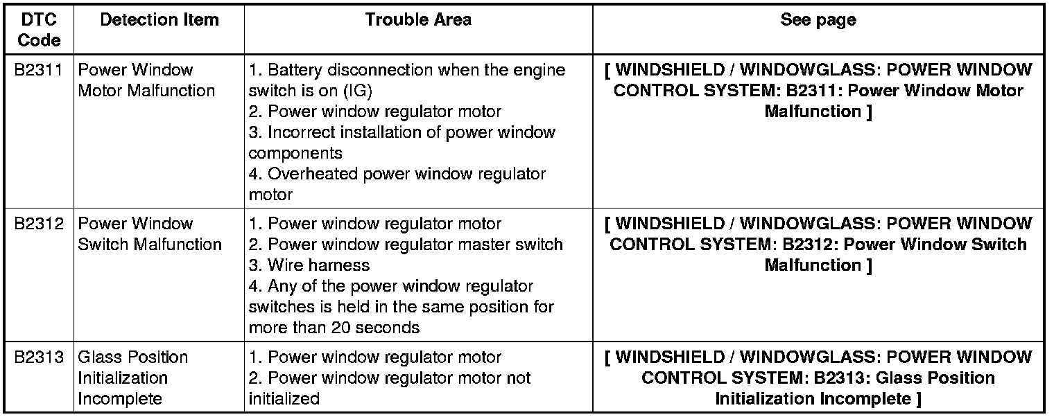 WINDSHIELD / WINDOWGLASS: POWER WINDOW CONTROL SYSTEM: DIAGNOSTIC TROUBLE CODE CHART