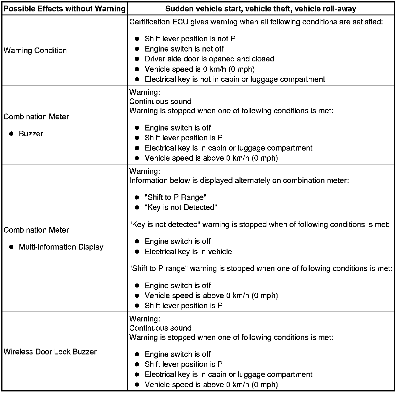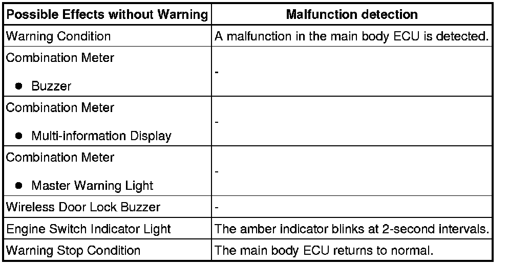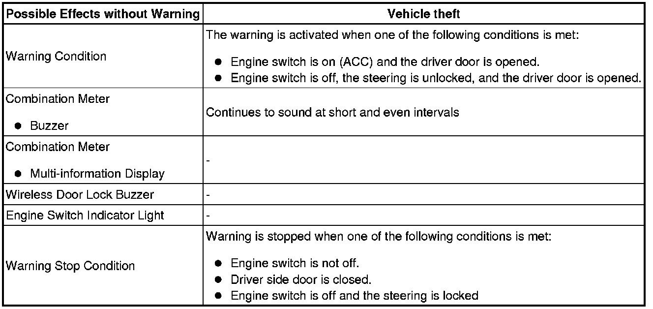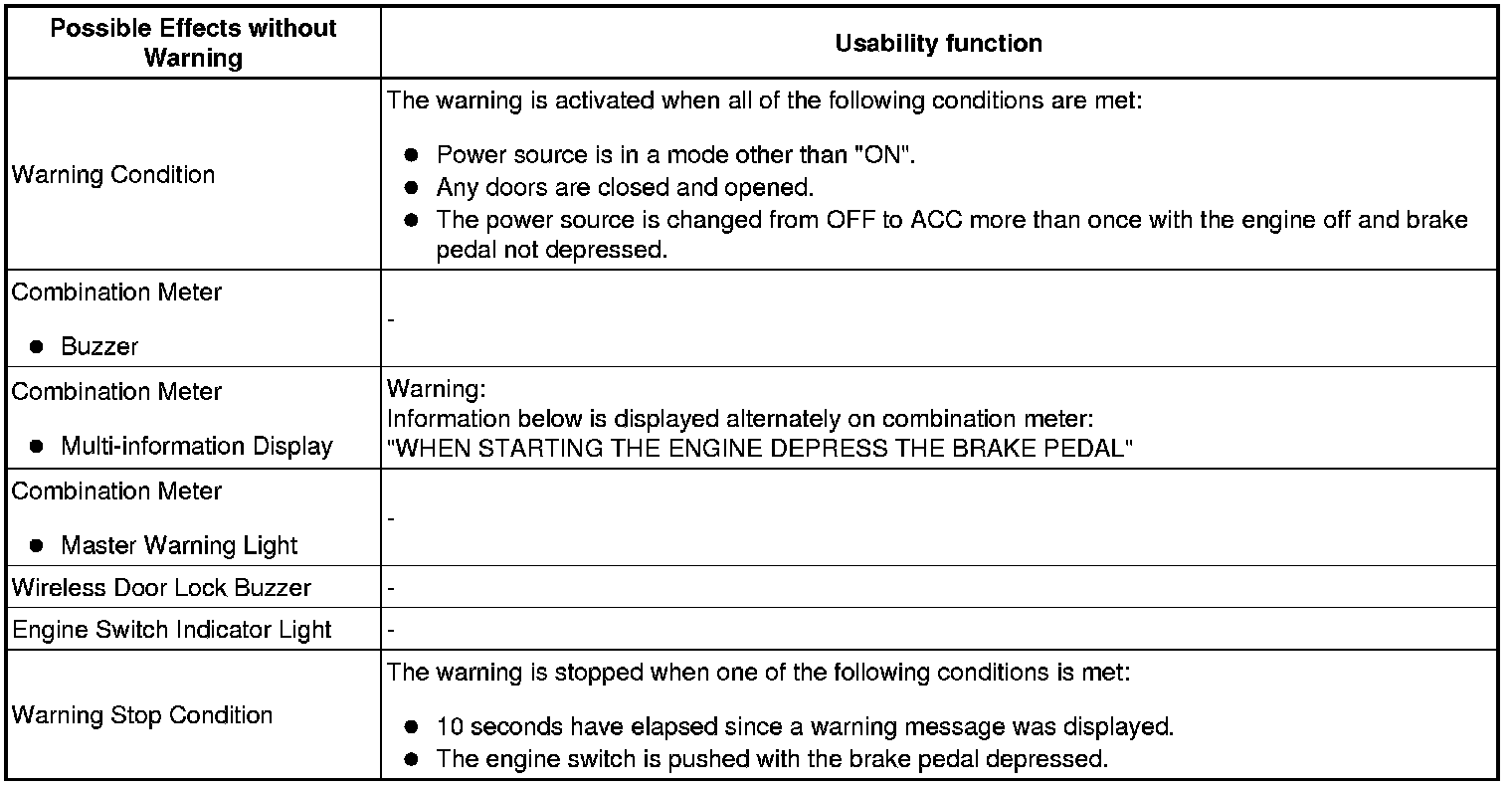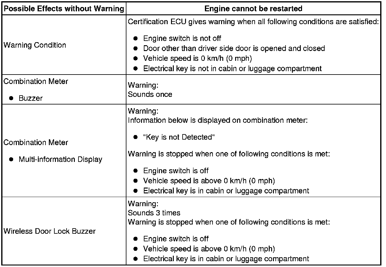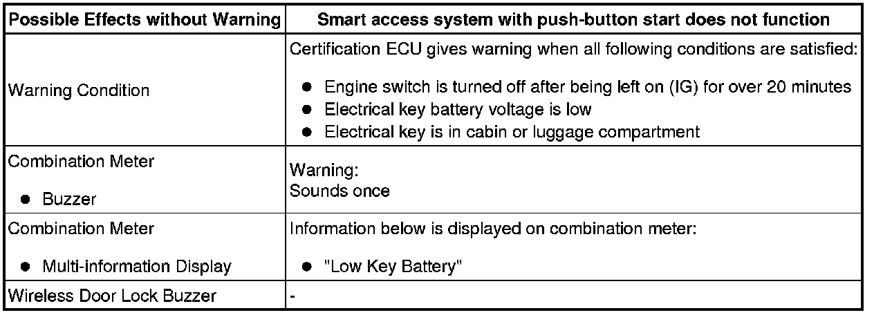 When any of the situations below occur, the smart access system with push-button start causes the certification ECU to sound the buzzer in the combination meter and the wireless door lock buzzer, and illuminate the combination meter's multi-information display in order to alert the driver.