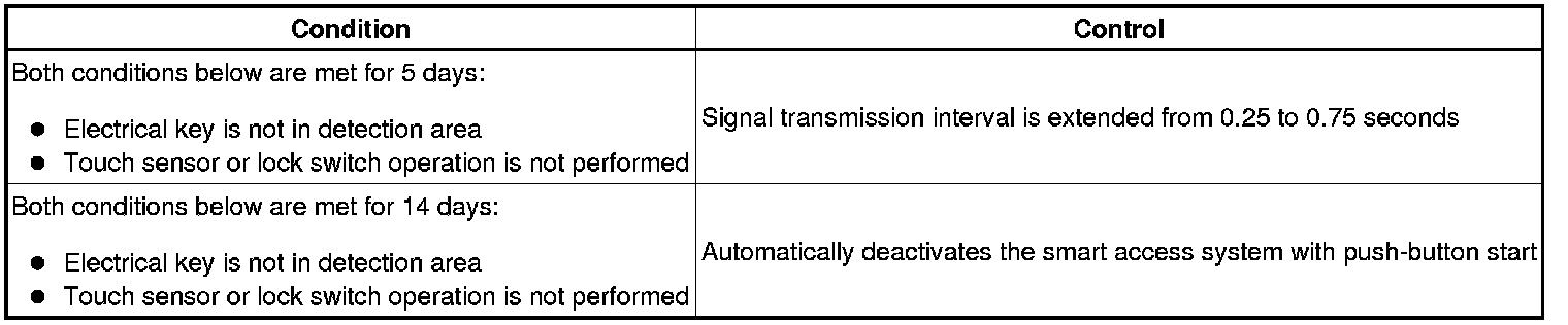 In the smart access system with push-button start, signals are emitted outside of the vehicle at a prescribed interval (0.25 seconds) when the doors are locked. Therefore, the vehicle battery could be drained if the vehicle remains parked for a long time. For this reason, the controls listed below are carried out: