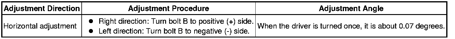 * If "LEFT SIDE: 1.0°" is displayed, the divergence is 1.0° in the left direction. Turn the bolt B approximately 2.5 turns to the negative (-) side.