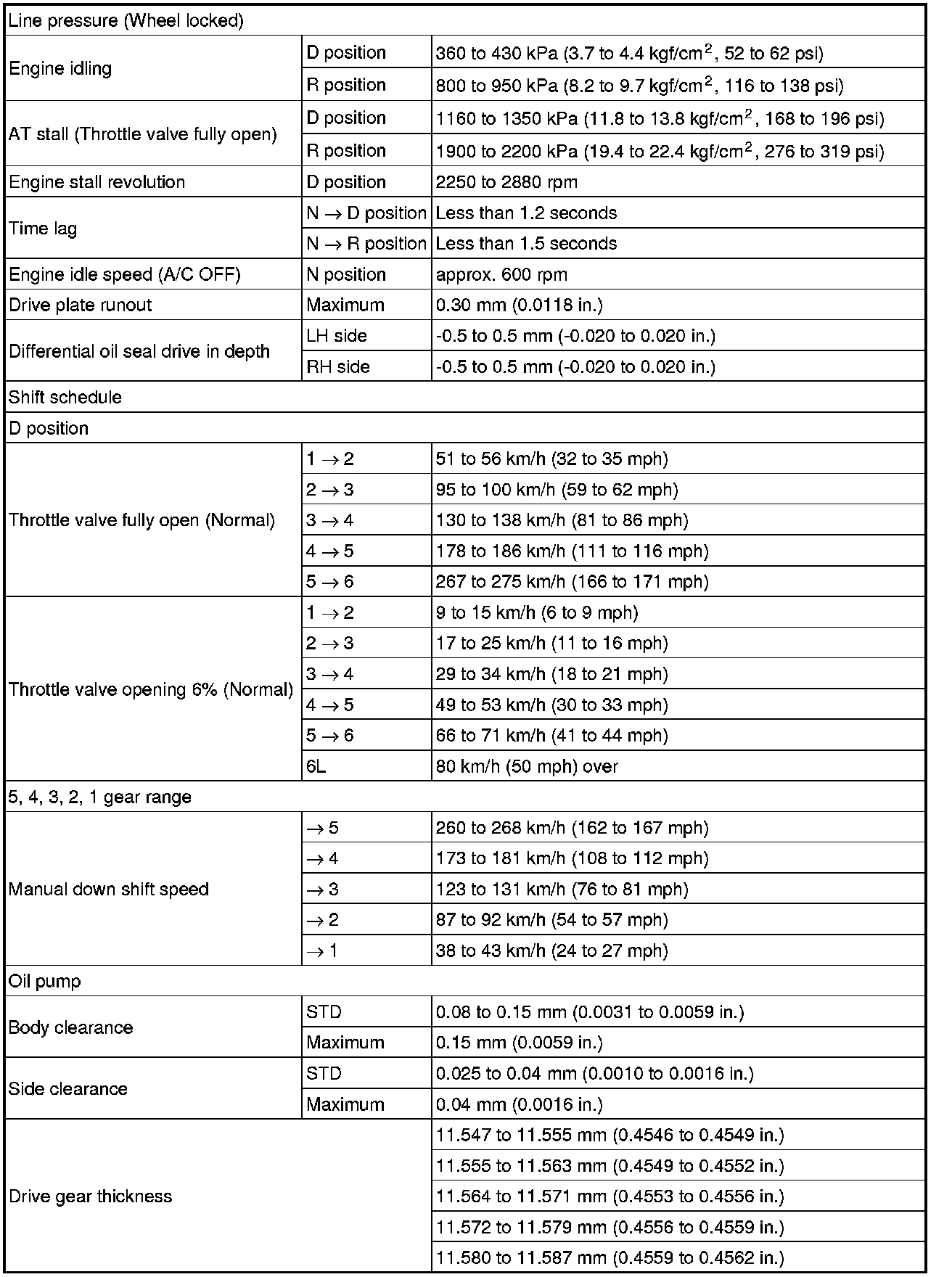 SERVICE SPECIFICATIONS: U660E AUTOMATIC TRANSAXLE: SERVICE DATA