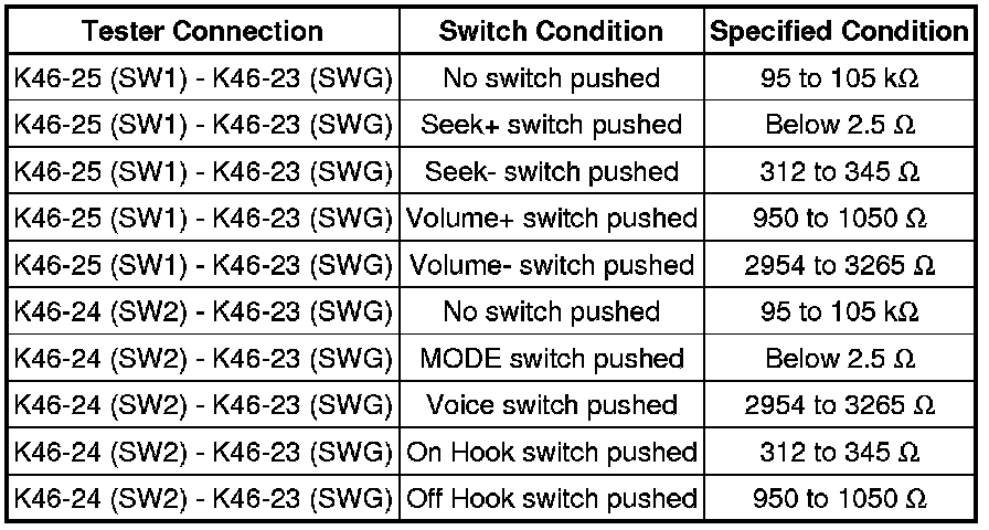 If there is a short in the circuit, the resulting condition is the same as if the switch were continuously pressed. Therefore, the display and navigation module display cannot be operated using the steering pad switch assembly, and the display and navigation module display itself cannot function.