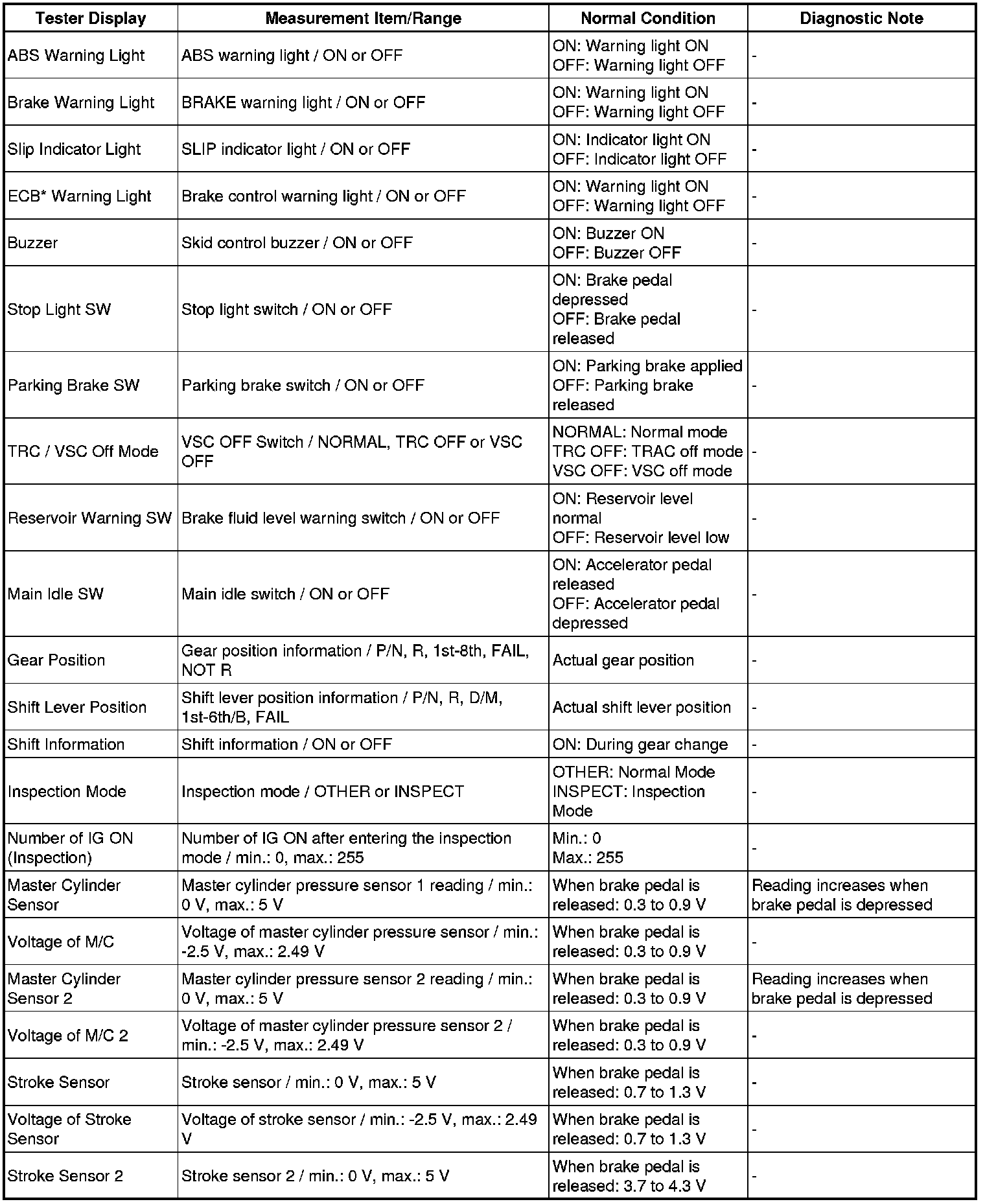 With the Techstream connected to the DLC3 and the engine switch on (IG), the Electronically Controlled Brake System, ABS, and VSC Data List can be displayed. Follow the prompts on the tester screen to access the Data List.