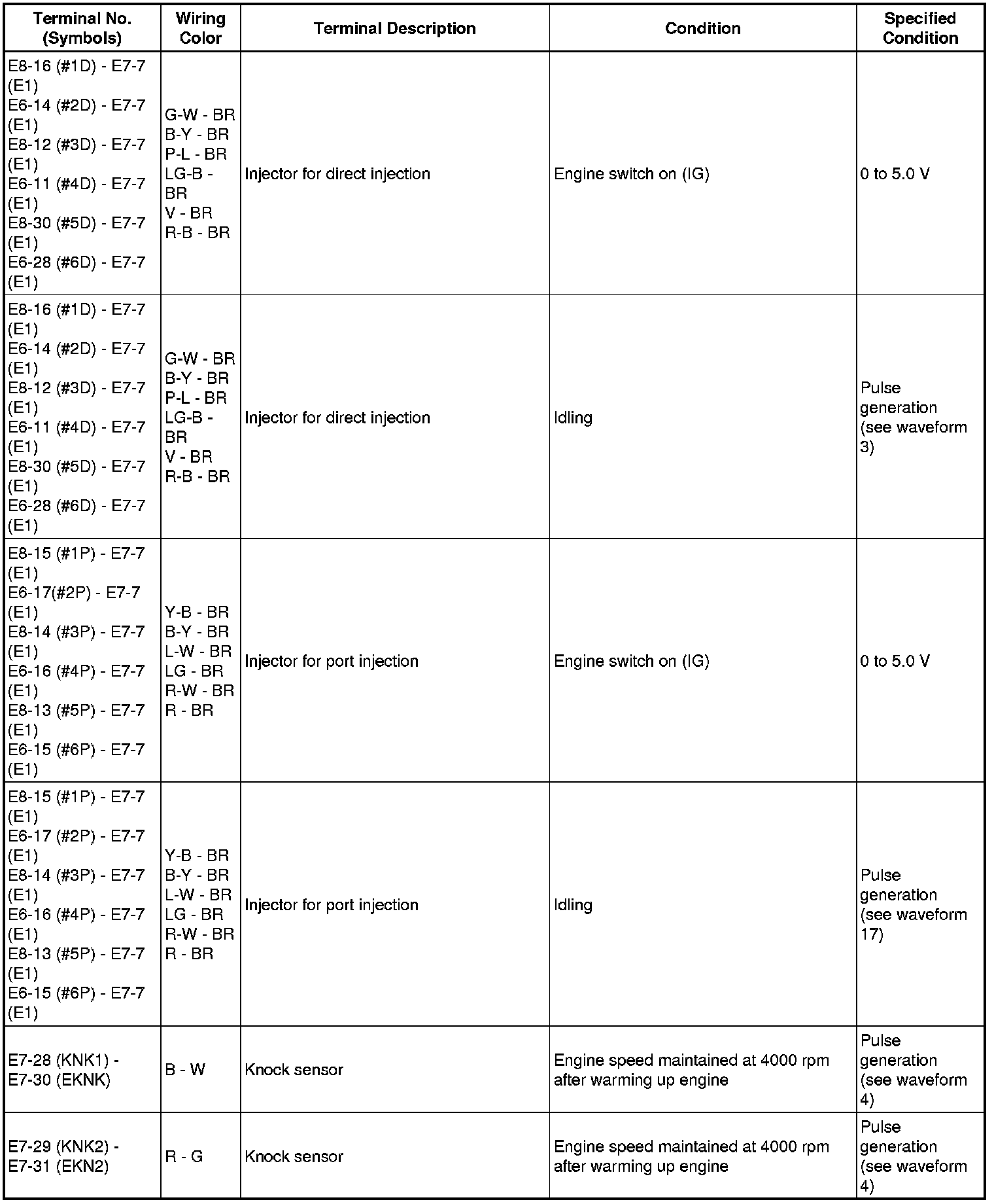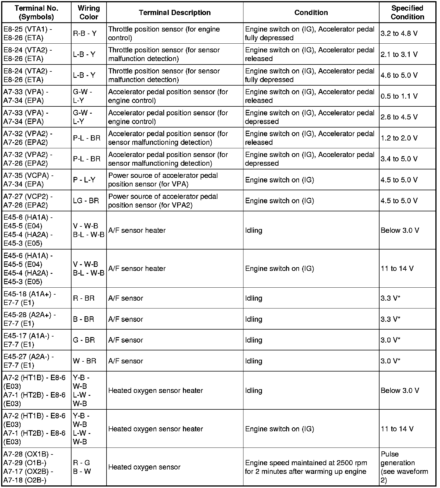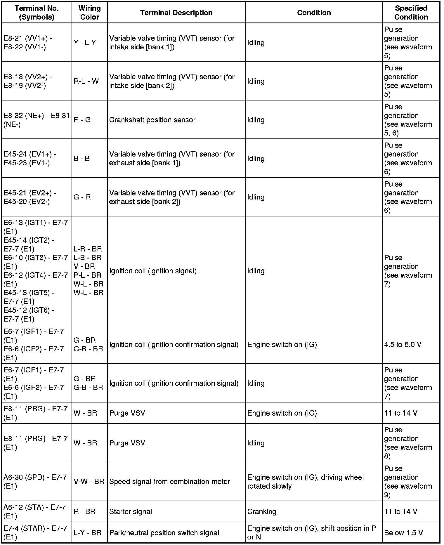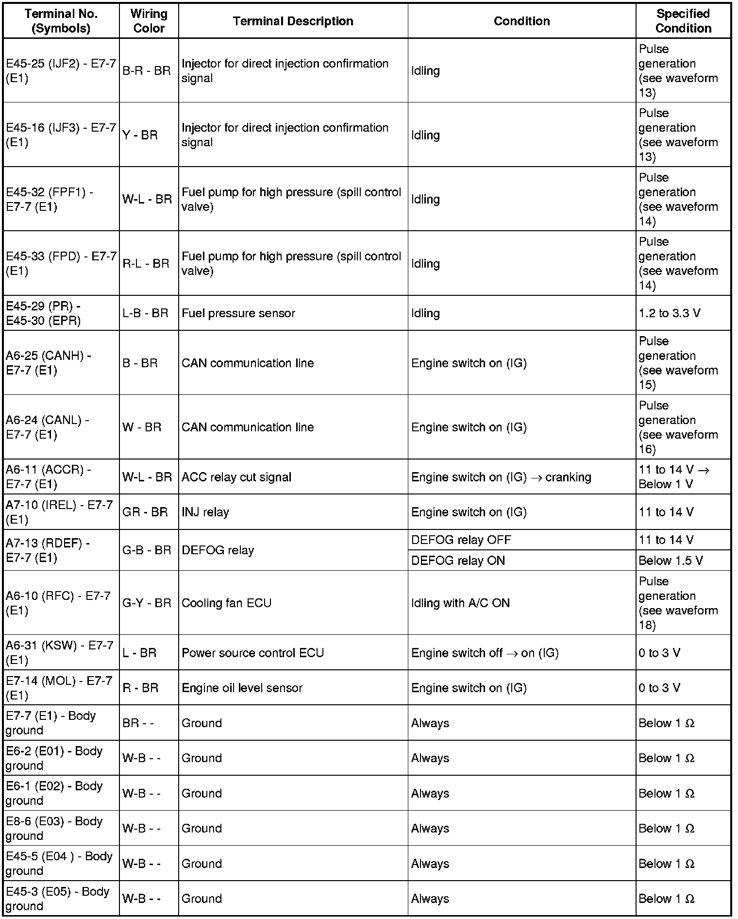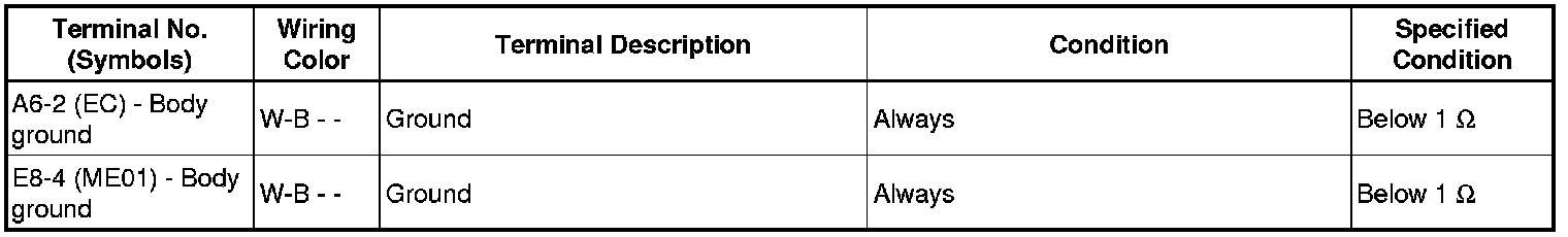 The standard normal voltage between each pair of the ECM terminals is shown in the table below. The appropriate conditions for checking each pair of the terminals are also indicated. The result of checks should be compared with the standard normal voltage for that pair of terminals, displayed in the Specified Condition column. The illustration above can be used as a reference to identify the ECM terminal locations.