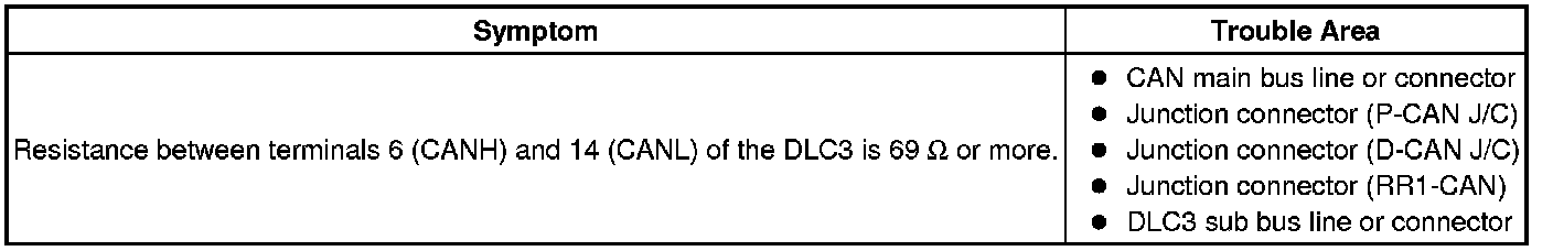 There may open circuit in the CAN main bus line and/or the DLC3 sub bus line when the resistance between terminals 6 (CANH) and 14 (CANL) of the DLC3 is 69 Ohms or more.