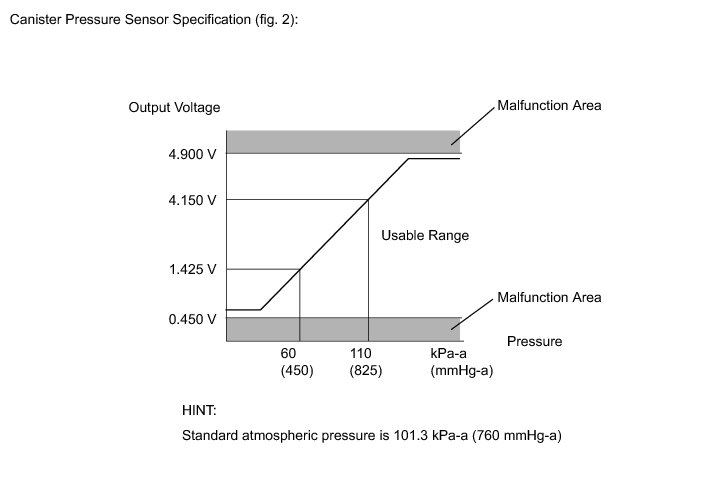 * The vent valve is turned OFF (open) and the EVAP pressure is measured. If the variation in the pressure is less than 0.5 kPa-g (3.75 mmHg-g), the ECM interprets this as the purge VSV being stuck closed, illuminates the MIL and sets DTC P0441 (2 trip detection logic).