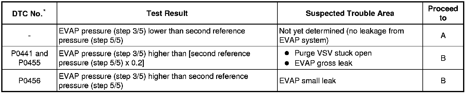 If the reference pressure difference between the first and second checks is greater than the specification, all the DTCs relating to the reference pressure (P043E, P043F, P2401, P2402 and P2419) are stored.