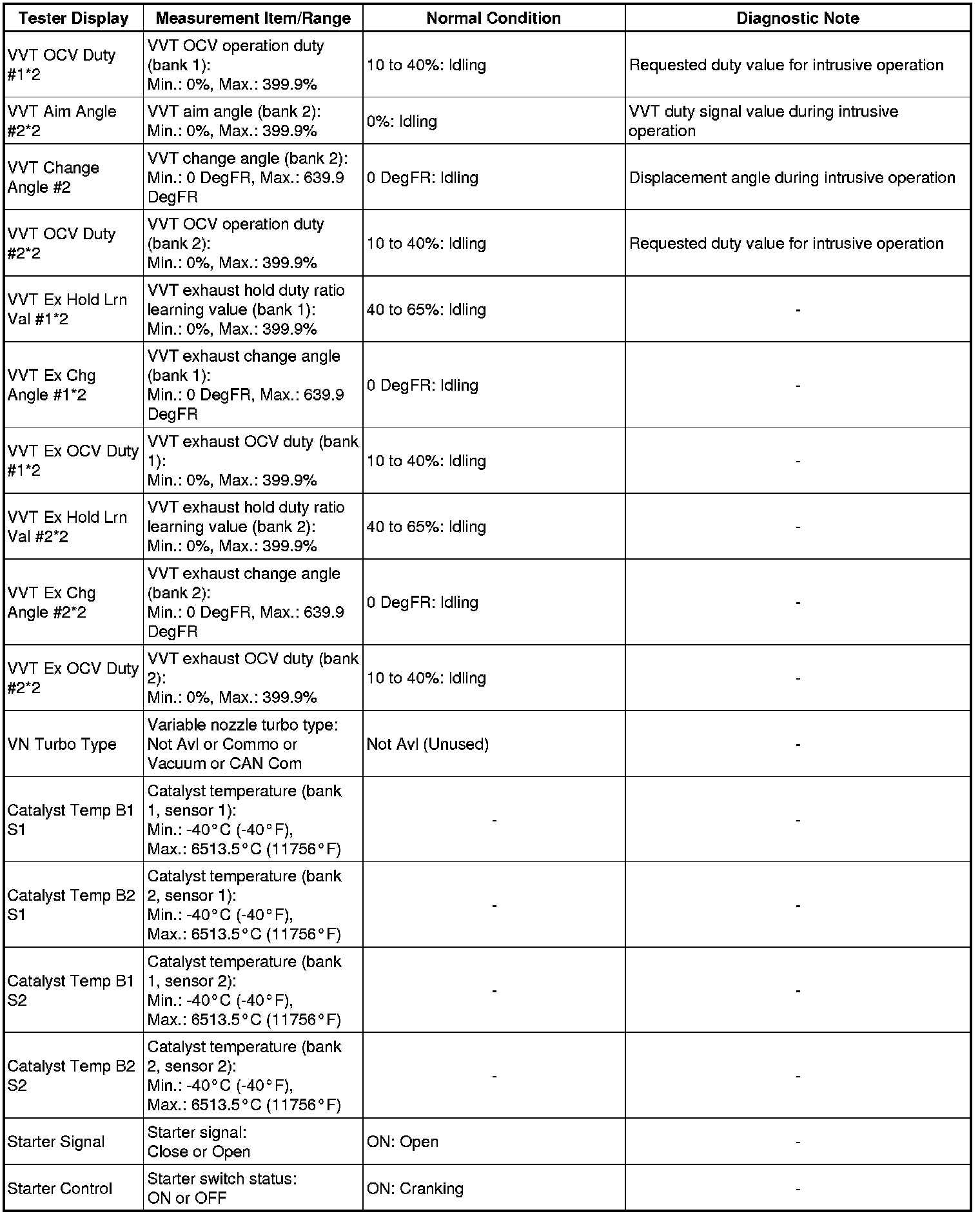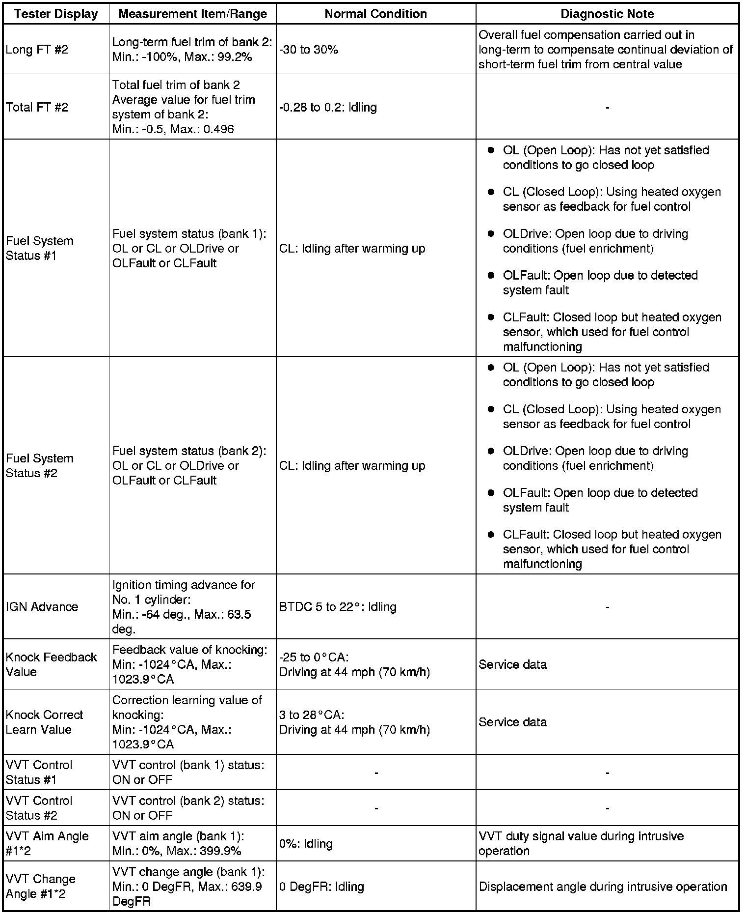 * *2: Data List values are only displayed when performing the following Active Test: Control the VVT System (Bank 1, 2), Control the VVT Linear (Bank 1, 2) and Control the Exhaust VVT Linear (Bank 1, 2). For other Active Tests, the Data List value will be 0.