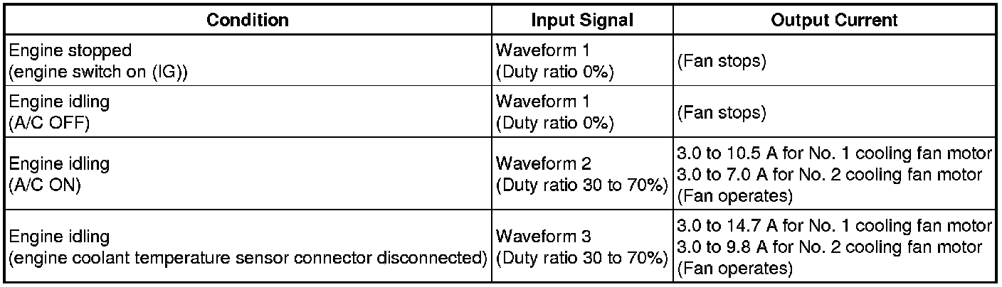* If the output current is abnormal even when the input signal is normal, there is a malfunction in the cooling fan ECU (S1), cooling fan motor or power source circuit.