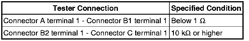 * If the results match the examples above, an open circuit exists in the wire harness between terminal 1 of connector B and terminal 1 of connector C.