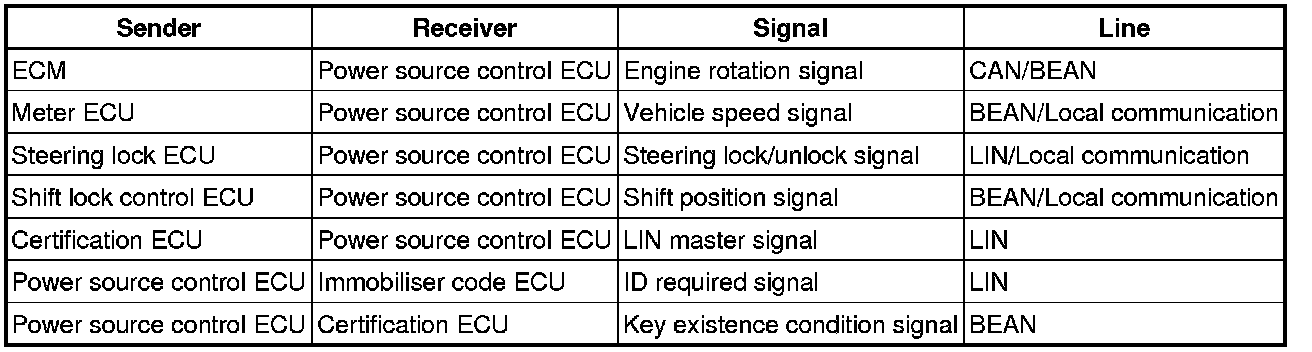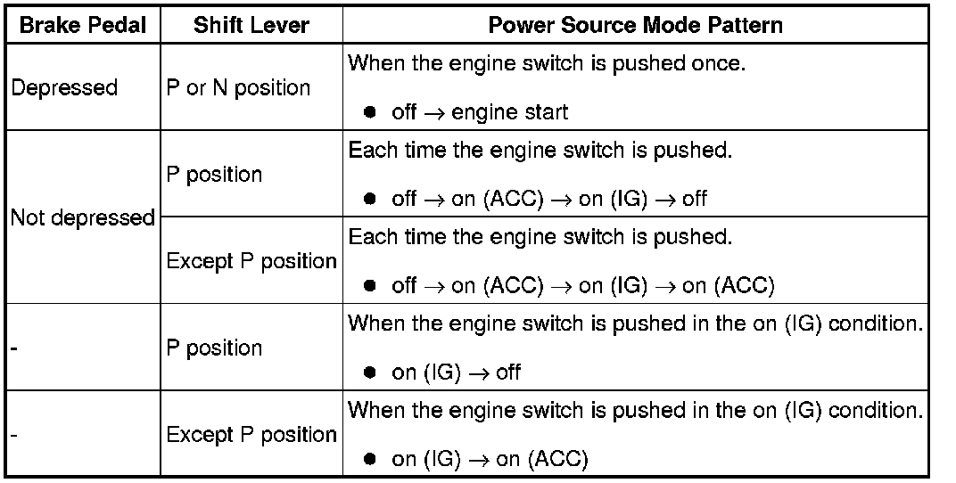(a) The push-button start uses a push-type engine switch, which the driver can operate by merely carrying the key. This system consists primarily of the power source control ECU, engine switch, ID code box, steering lock ECU, key, ACC relay, IG1 relay, IG2 relay and certification ECU. The power source control ECU controls the system. This function operates in cooperation with the smart access system. The table below shows the transition of the engine switch, which depends on whether the brake pedal is depressed or released.