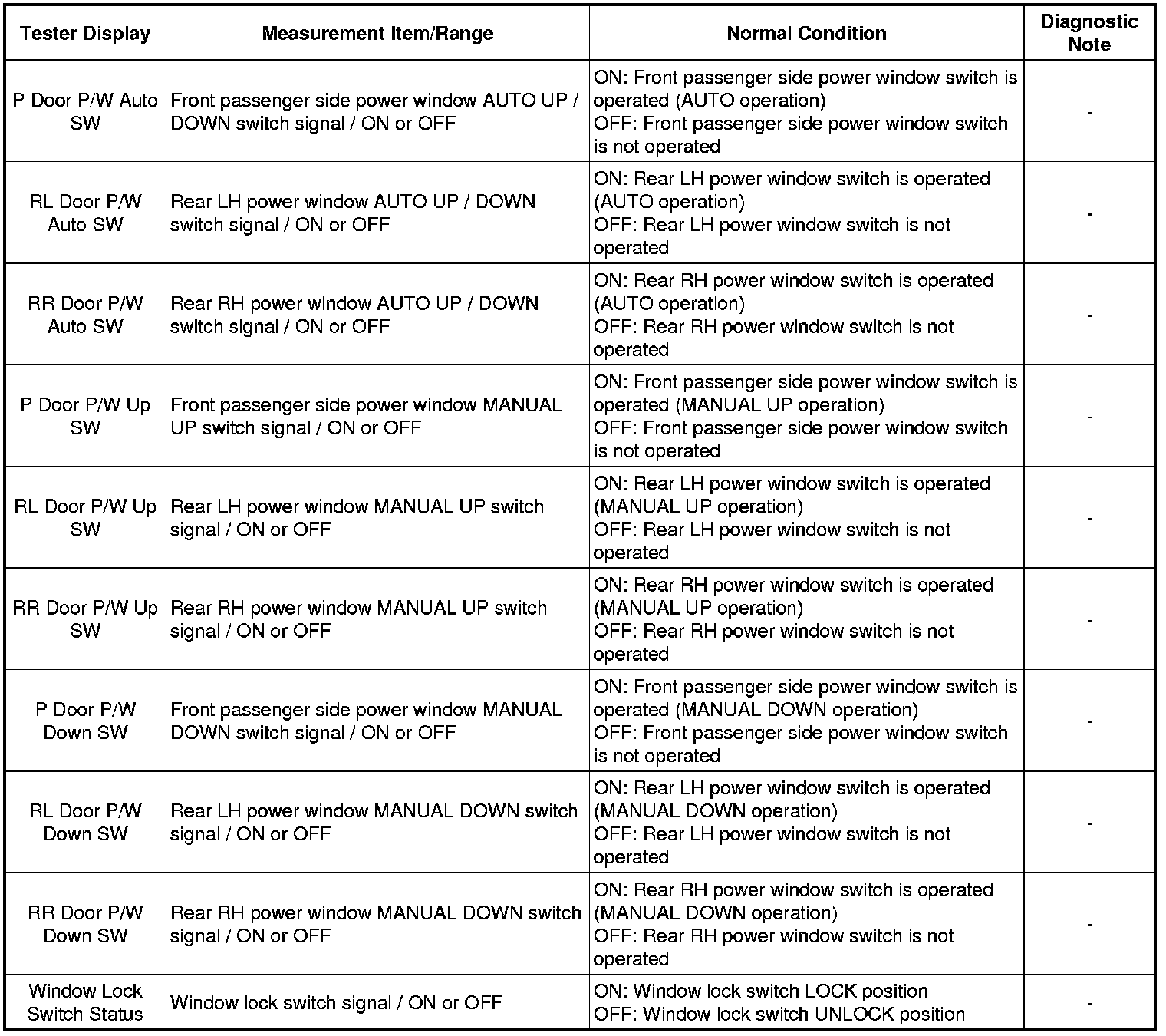 When the engine switch on (IG) and the window lock switch is OFF, the power window master switch sends remote up / down signal to each power window regulator motor via the LIN communication line.