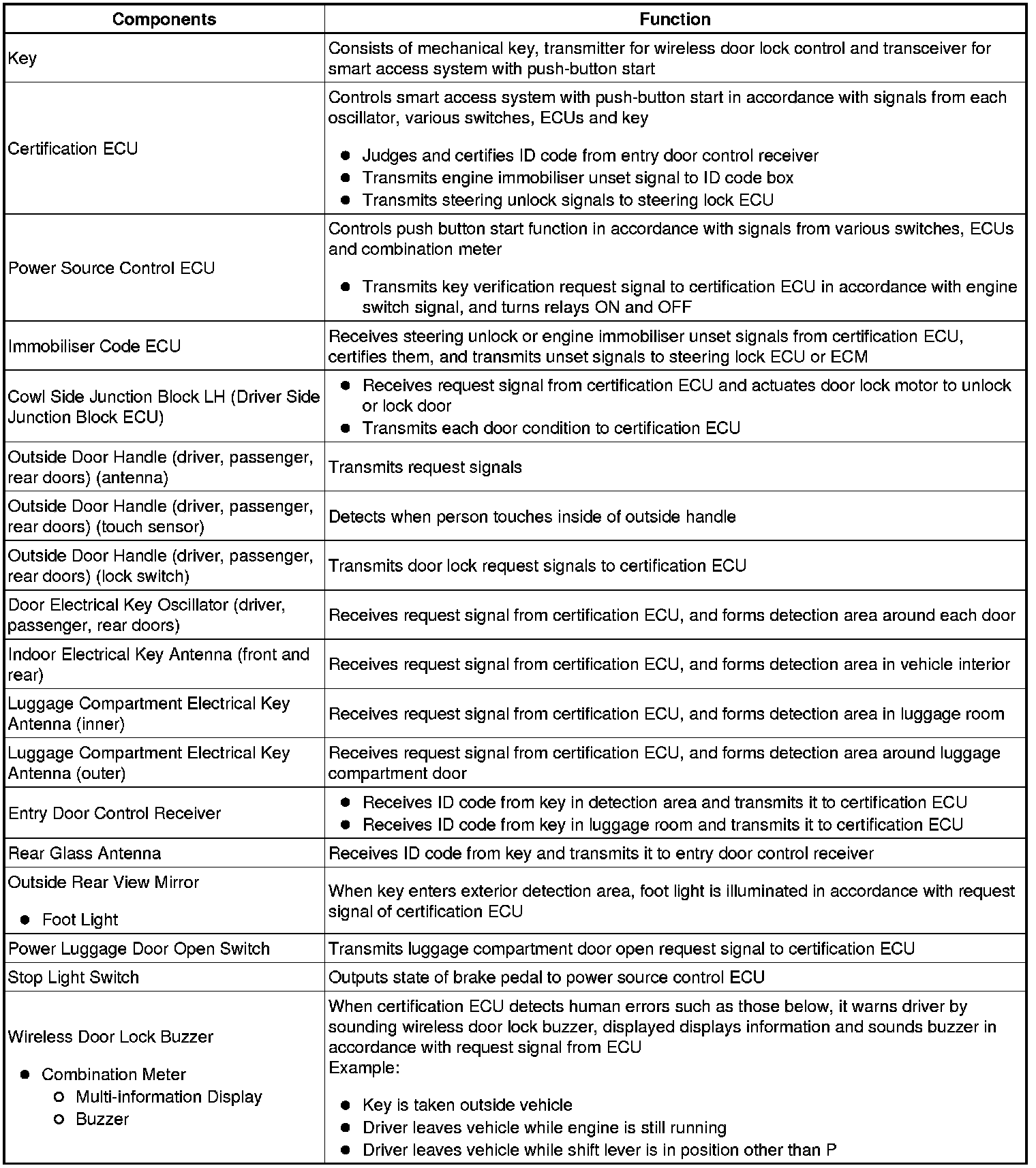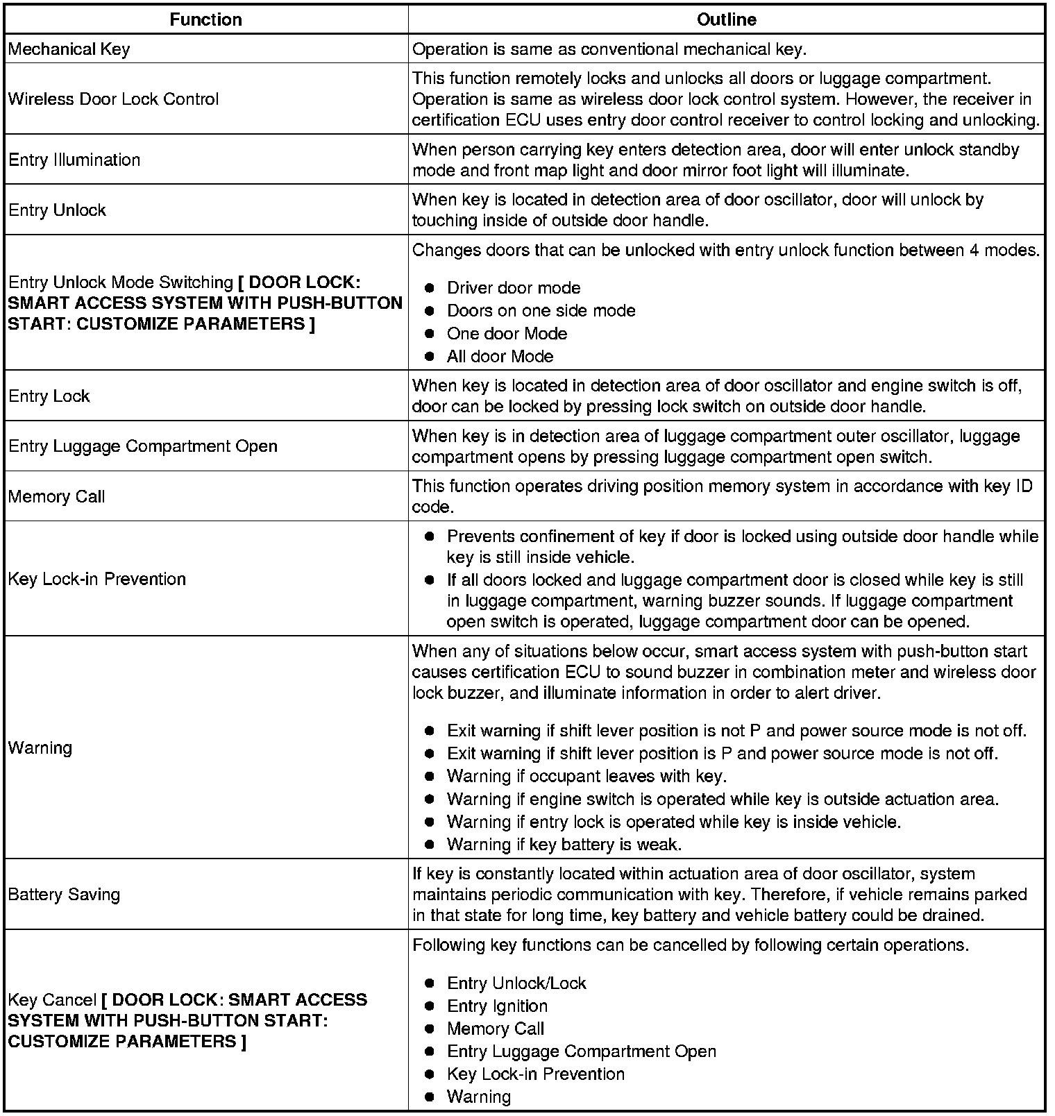 (a) In addition to conventional mechanical key and wireless door lock control functions, the smart access system with push-button start enables door locking/unlocking, steering lock releasing, engine starting and luggage compartment door opening without operating the key. The only requirement is that the key is in the user's possession.