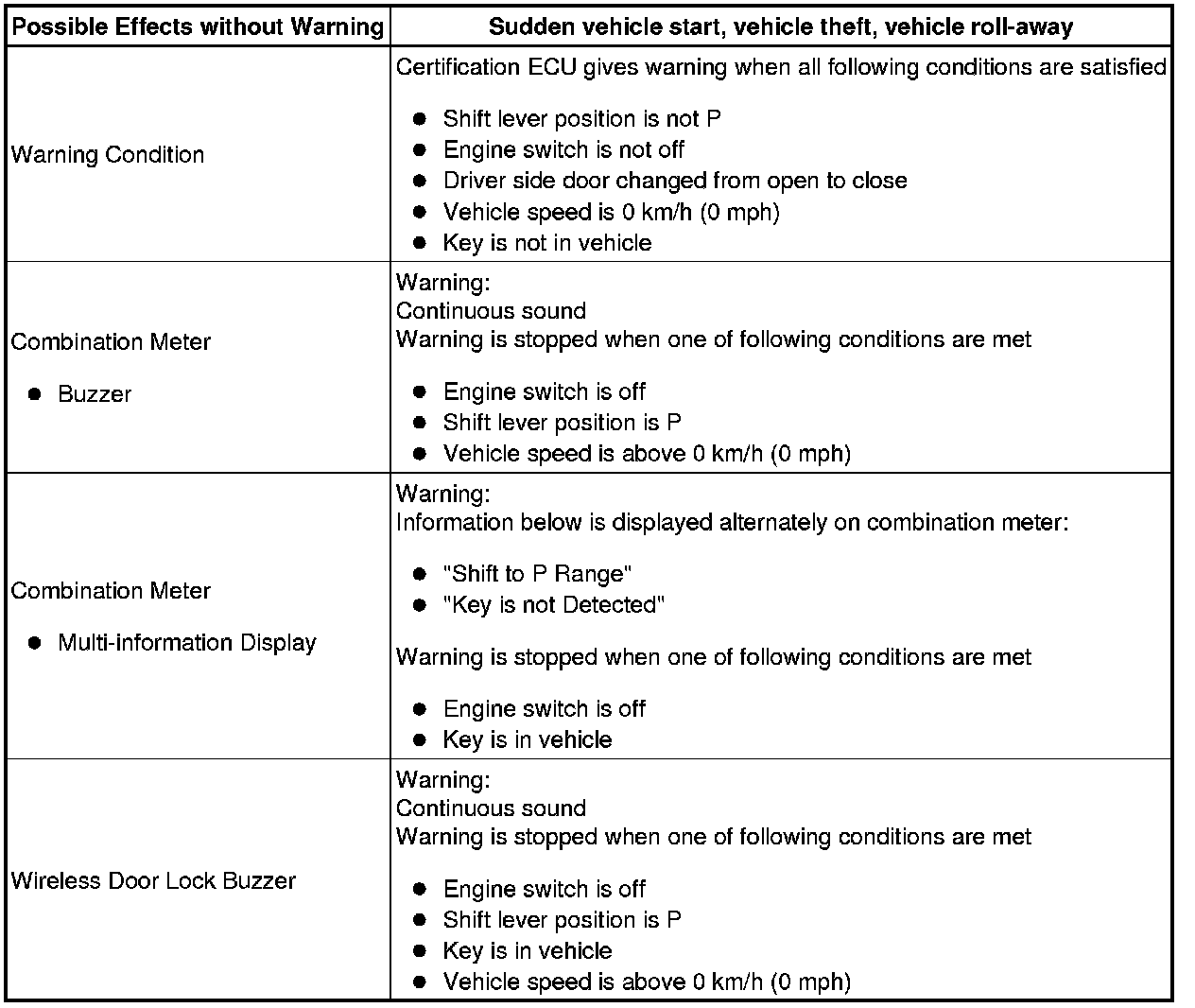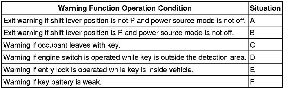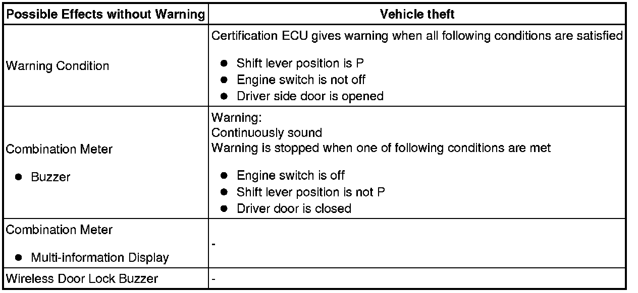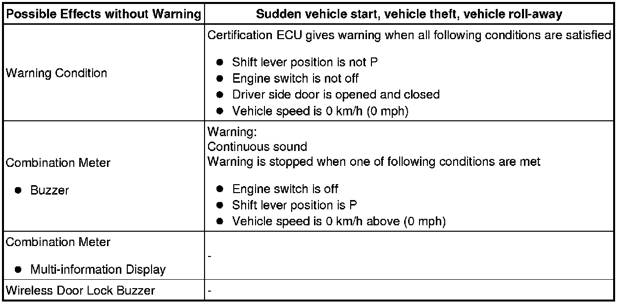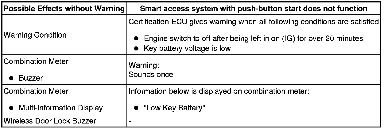 When any of the situations below occur, the smart access system with push-button start causes the certification ECU to sound the buzzer in the combination meter and the wireless door lock buzzer, and illuminates the combination meter's multi-information display in order to alert the driver.