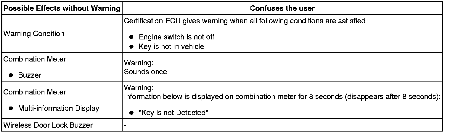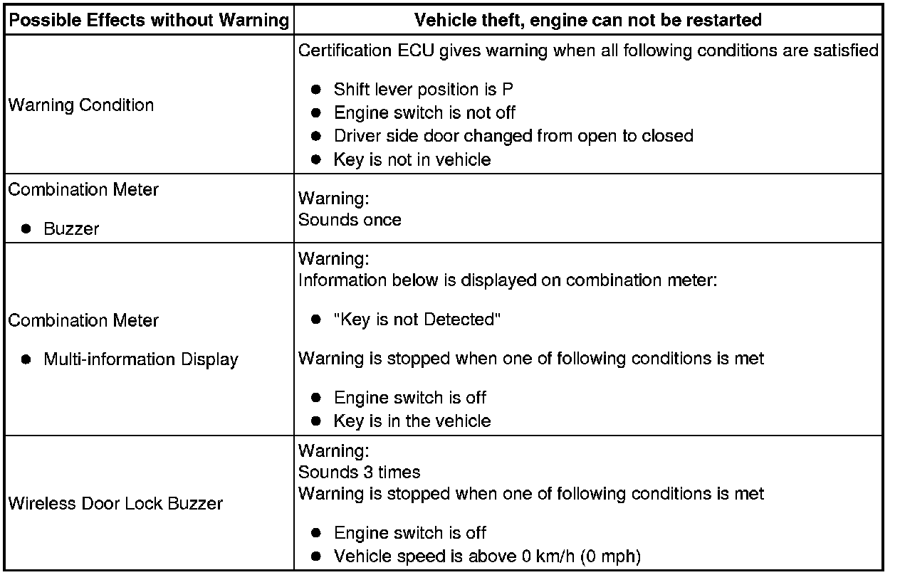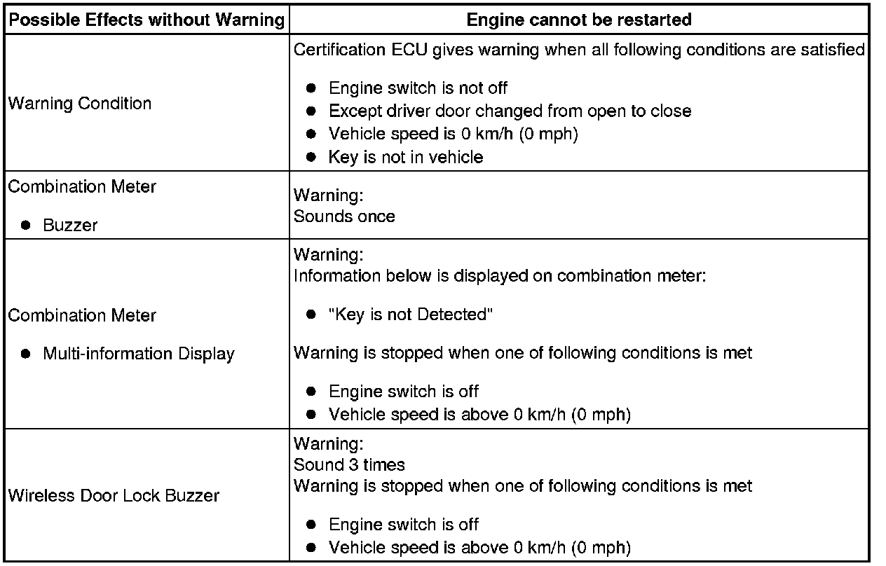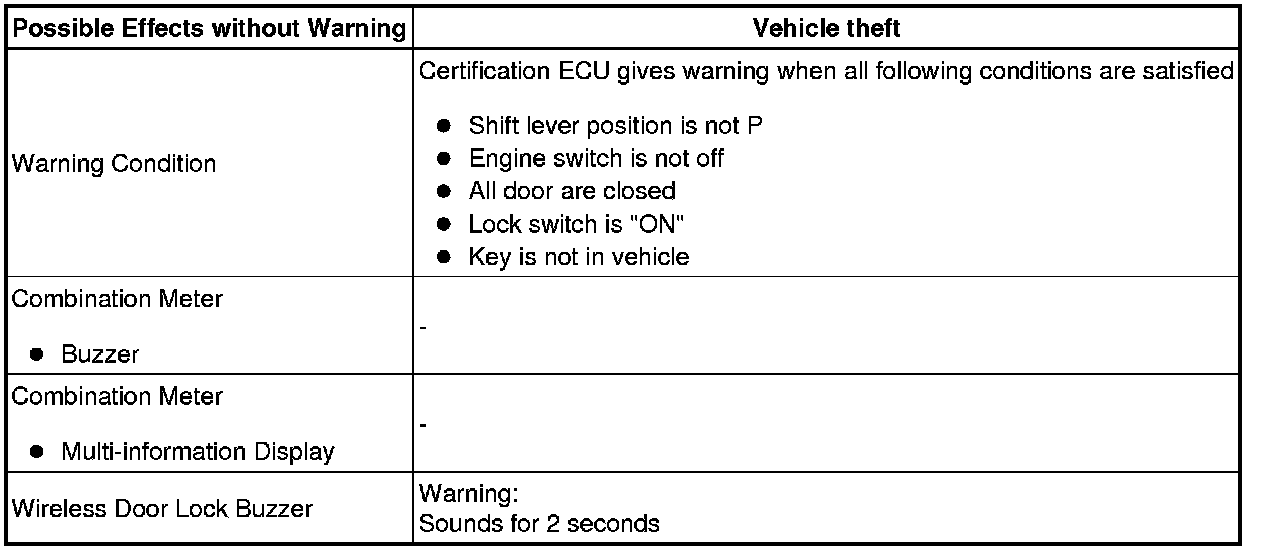 When any of the situations below occur, the smart access system with push-button start causes the certification ECU to sound the buzzer in the combination meter and the wireless door lock buzzer, and illuminates the combination meter's multi-information display in order to alert the driver.
