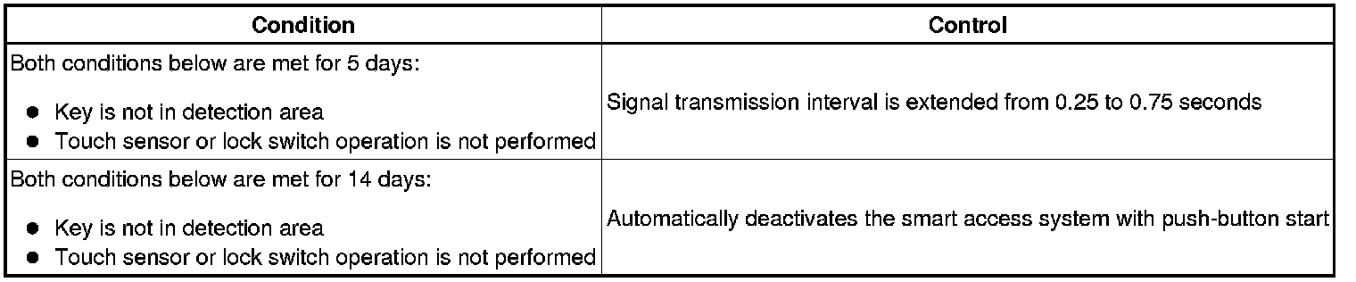 In the smart access system with push-button start, signals are emitted outside of the vehicle at a prescribed interval (0.25 seconds) when the doors are locked. Therefore, the vehicle battery could be drained if the vehicle remains parked for a long time. For this reason, the controls listed below are affected.