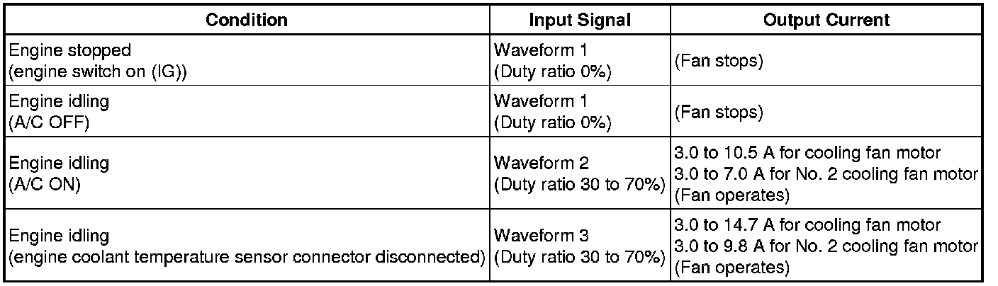 * If the output current is abnormal even when the input signal is normal, there is a malfunction in the cooling fan ECU, cooling fan motor or power source circuit.