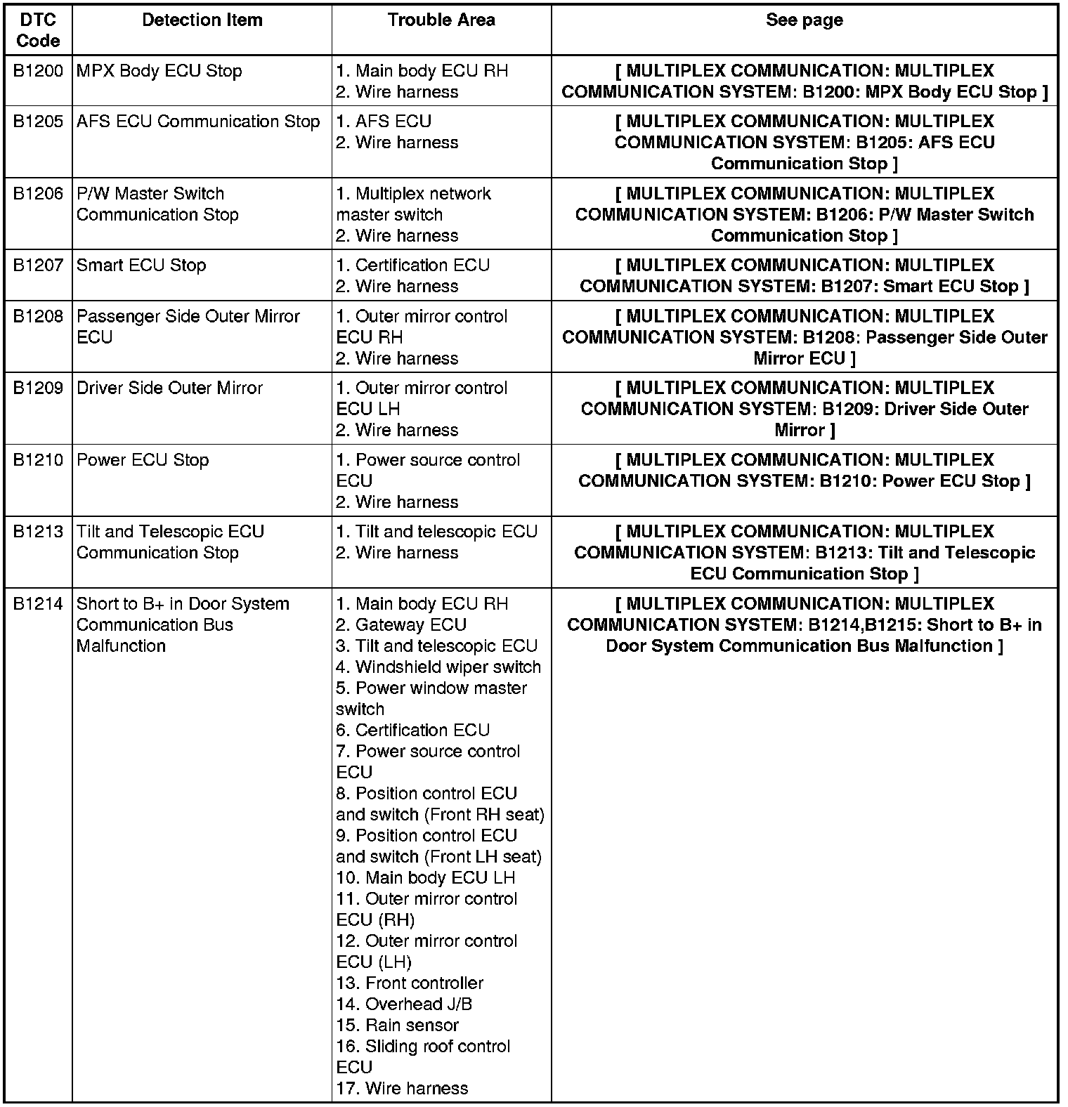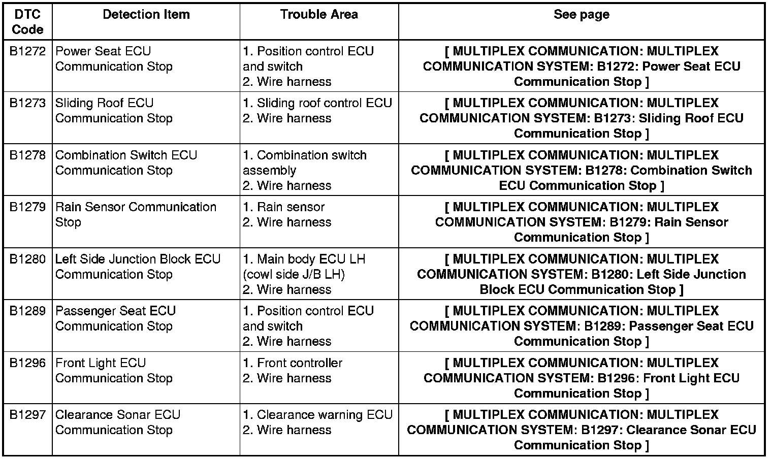 MULTIPLEX COMMUNICATION: MULTIPLEX COMMUNICATION SYSTEM: DIAGNOSTIC TROUBLE CODE CHART