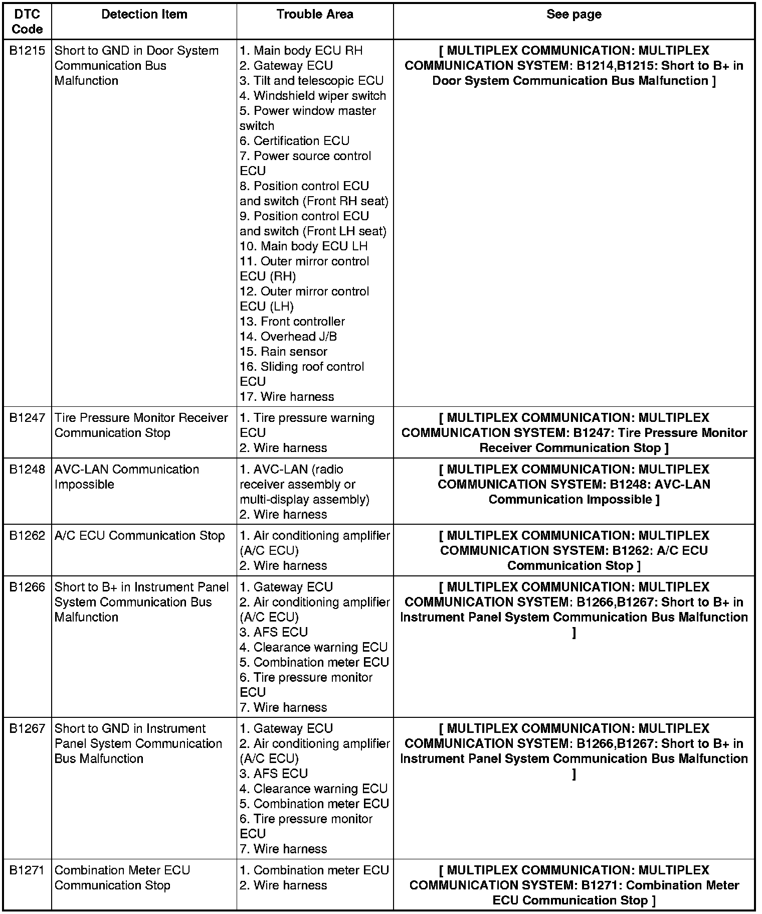When "+B or GND short malfunction of communication bus" DTCs (B1266 and B1267) are detected at the same time as "communication stop" DTCs (B1200, B1205, B1216, B1208, B1209, B1213, B1272, B1287 and B1294), please repair the "+B or GND short malfunction of communication bus" DTCs first.
