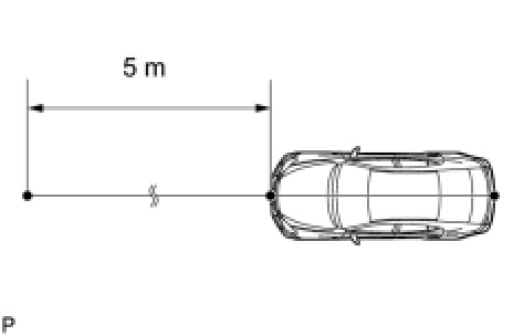 (2) Set one end of the 10 m (32.82 ft.) string on the vehicle's rear center point. Run the string over the vehicle's front center point to a position 5 m (16.41 ft.) beyond the vehicle front center point, as shown in the illustration. Mark the 5 m (16.41 ft.) position.