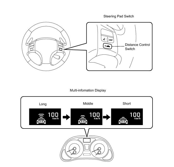 (d) Check that the indication of the vehicle-to-vehicle distance, which is shown on the multi-information display on the combination meter, changes from long to middle to short in that order.