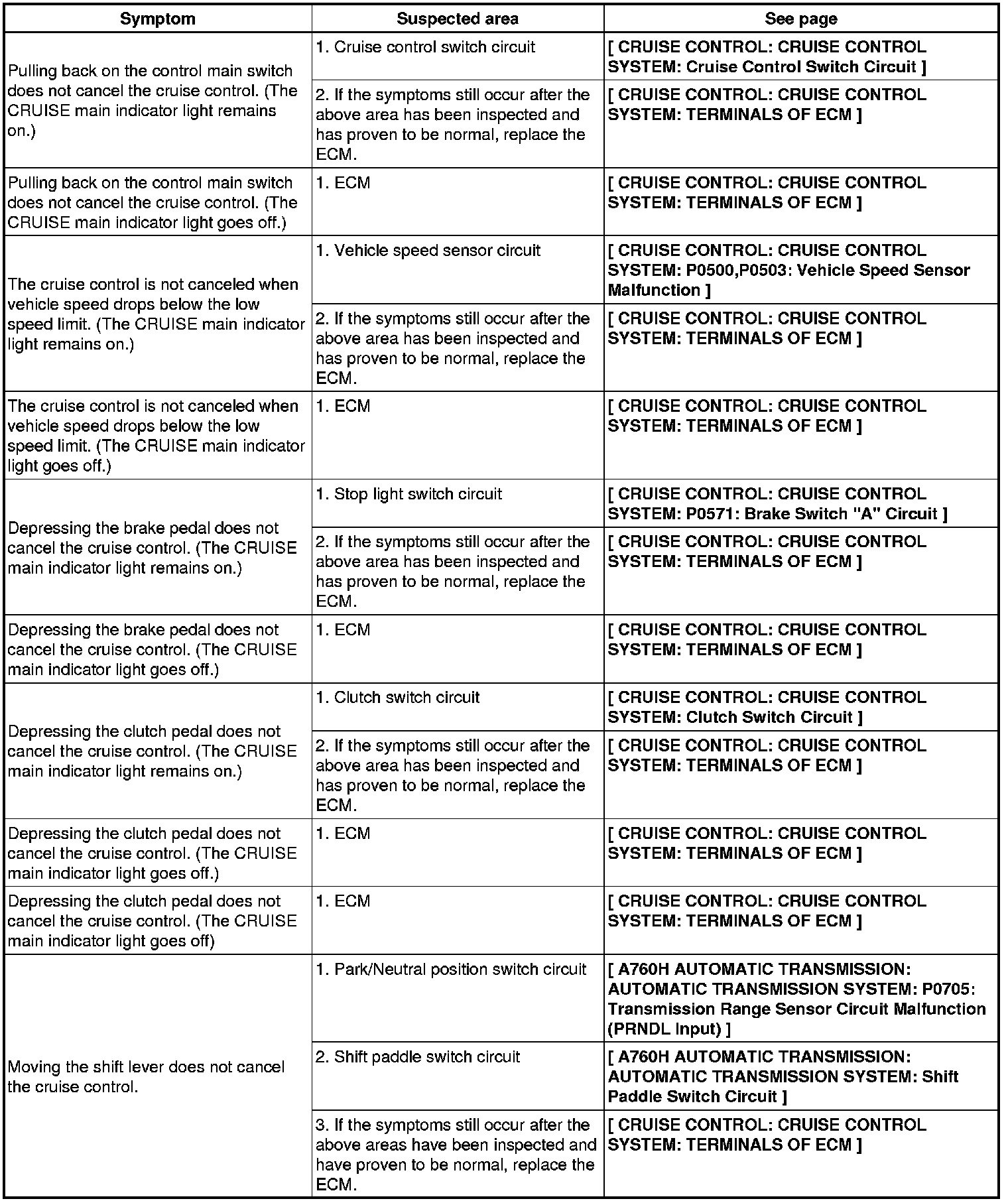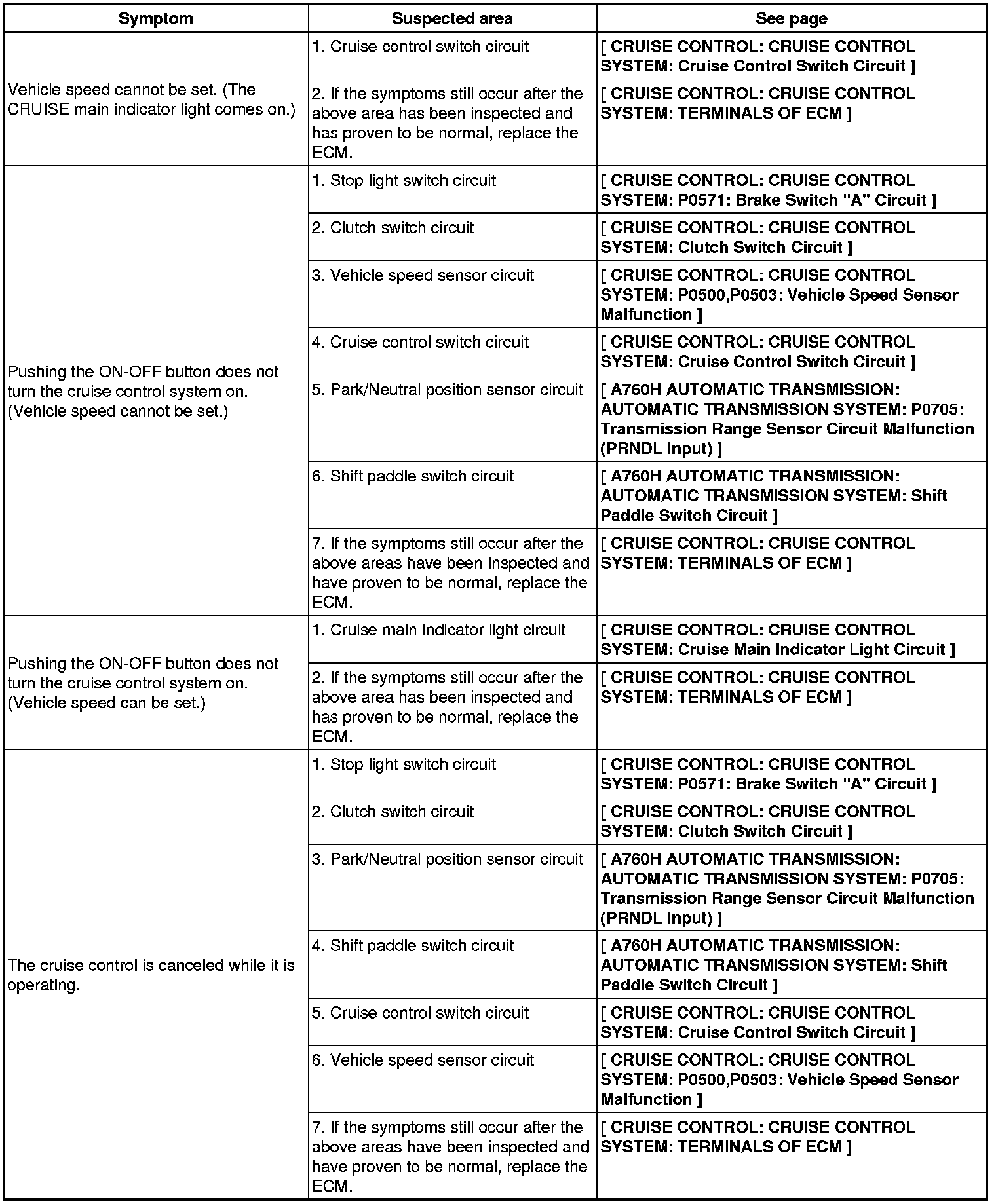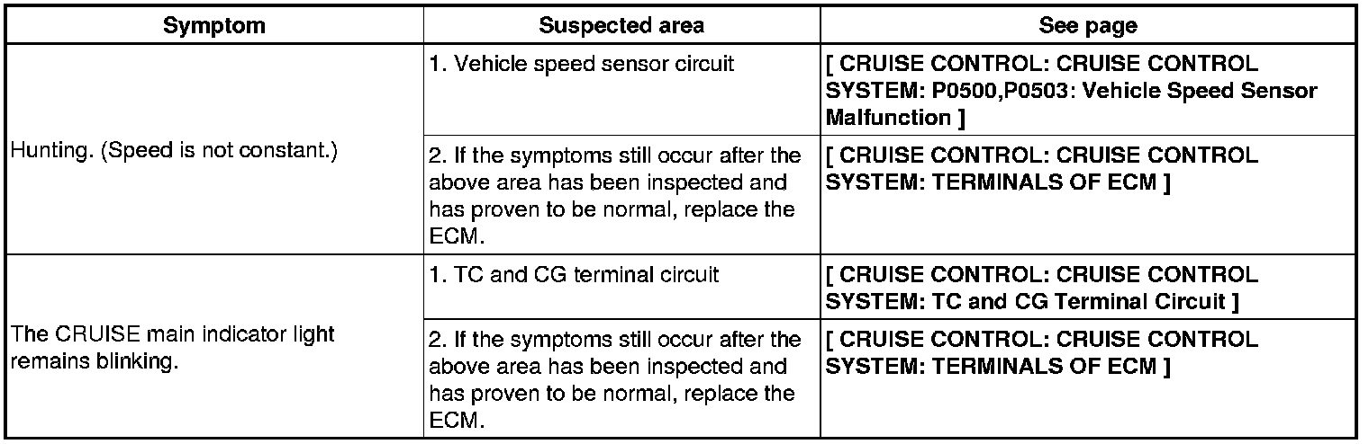 CRUISE CONTROL: CRUISE CONTROL SYSTEM: PROBLEM SYMPTOMS TABLE