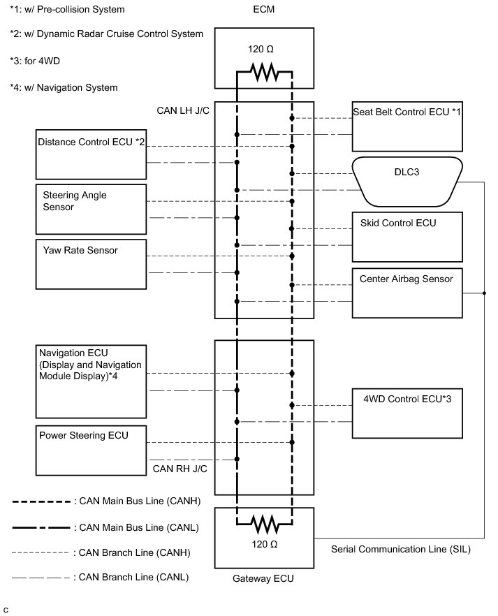 (1) The main bus line is a wire harness between the two terminating resistors on the bus (communication line). This is the main bus in the CAN communication system.