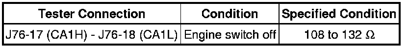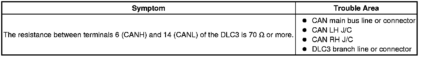 There may be an open circuit in the CAN main bus line and/or the DLC3 branch line when the resistance between terminals 6 (CANH) and 14 (CANL) of the DLC3 is 70 Ohms or more.
