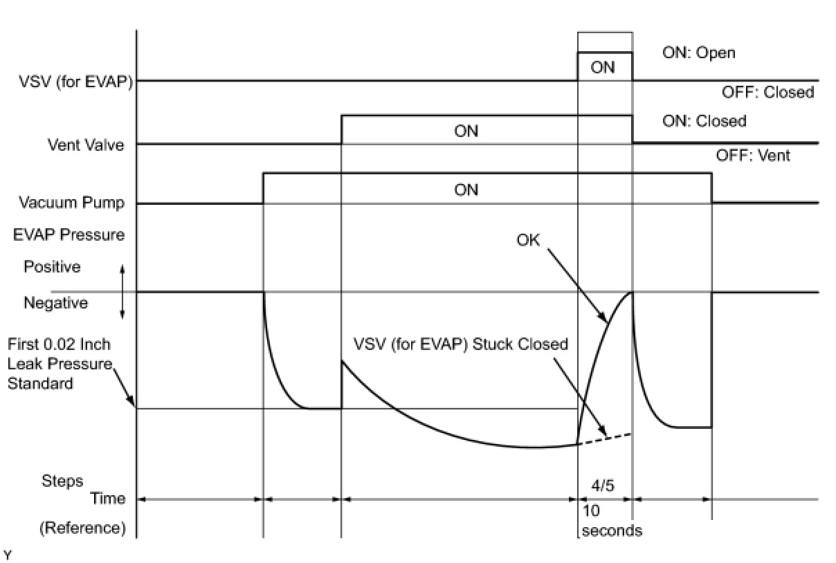 * The vent valve turned OFF (open) and the EVAP pressure is then measured. If the variation in the pressure is less than 0.5 kPa (3.75 mmHg), the ECM interprets this as the EVAP VSV being stuck closed, and illuminates the MIL and sets DTC P0441 (2 trip detection logic).