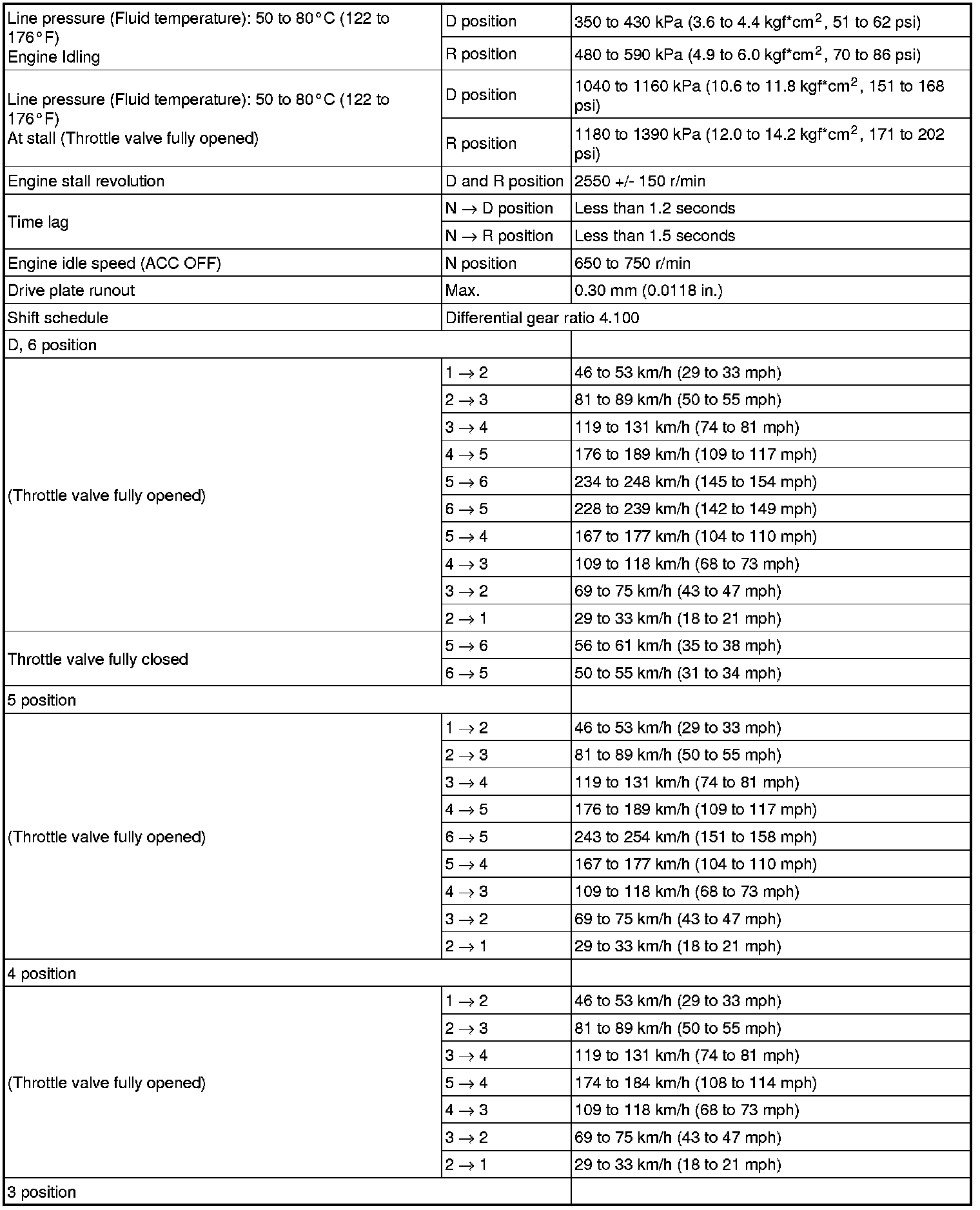 * All shift point values indicated in the above tables are actual values. Therefore, if checking a shift point with a chassis dynamometer, keep in mind that there is a range of error in the chassis dynamometer indication.