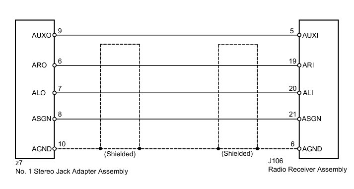 The No. 1 stereo jack adapter assembly sends an external device sound signal to the radio receiver assembly through this circuit.