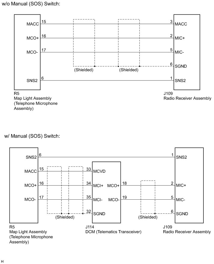 * Using this circuit, the DCM (telematics transceiver) sends power to the map light assembly (telephone microphone assembly), and the map light assembly (telephone microphone assembly) sends microphone signals to the radio receiver assembly via the DCM (telematics transceiver). The radio receiver assembly and map light assembly (telephone microphone assembly) are connected to each other using the microphone connection detection signal lines.