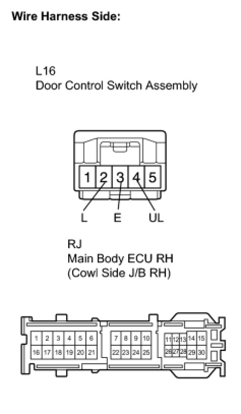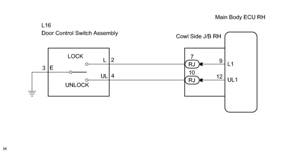 Terminals L1 and UL1 of the main body ECU RH are connected to the door control switch and door lock/unlock request signals (by door control switch operation) are received by the ECU.