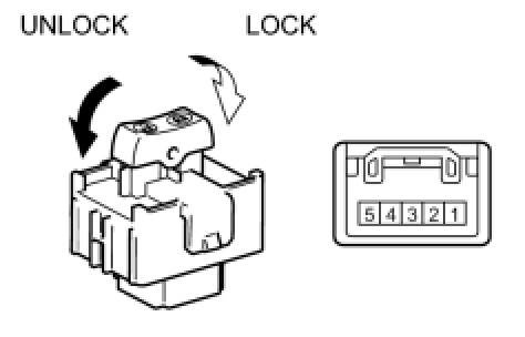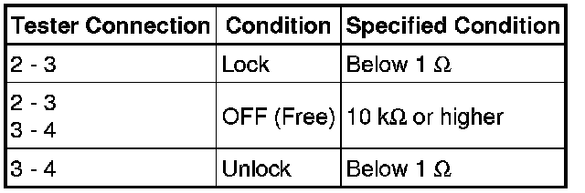 When the lock side of the door control switch assembly is pressed, continuity is established between terminals 2 and 3 of the switch. When the unlock side of the switch is pressed, continuity is established between terminals 4 and 3.