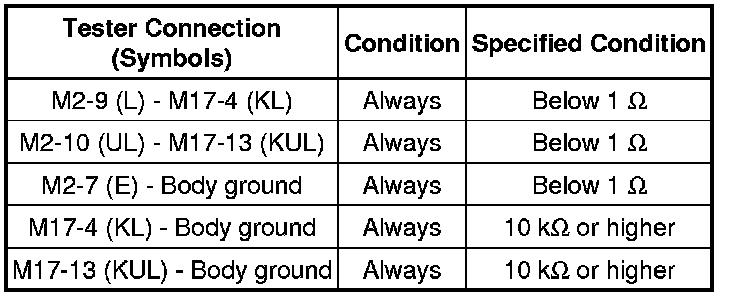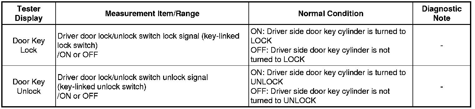 When the driver's door key cylinder is turned to lock all the doors by key, there is continuity between terminals L and E of the key lock and unlock switch. When the cylinder is turned to unlock the door(s), there is continuity between terminals UL and E.