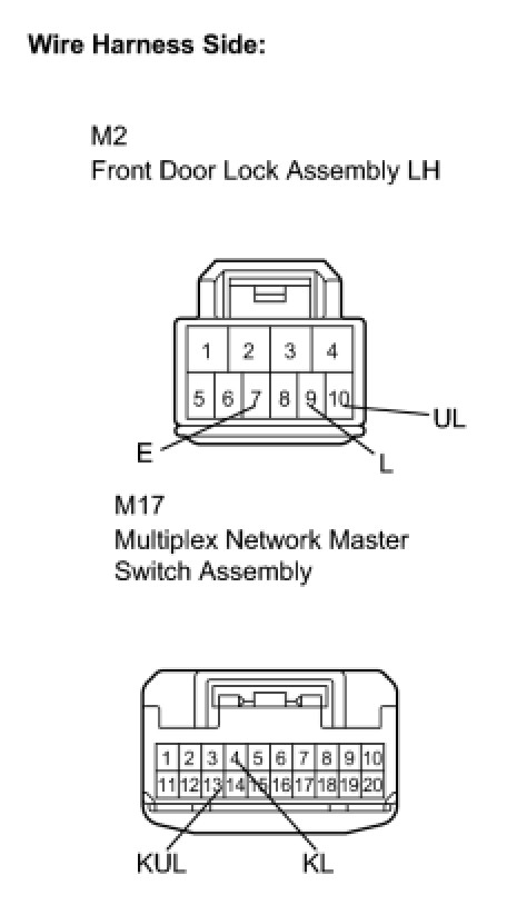 Terminals KL and KUL of the multiplex network master switch assembly are connected to the front door lock assembly LH, and door lock/unlock request signals (by key) are received by the multiplex network master switch assembly.