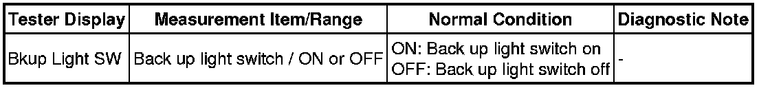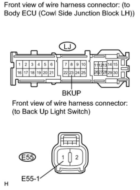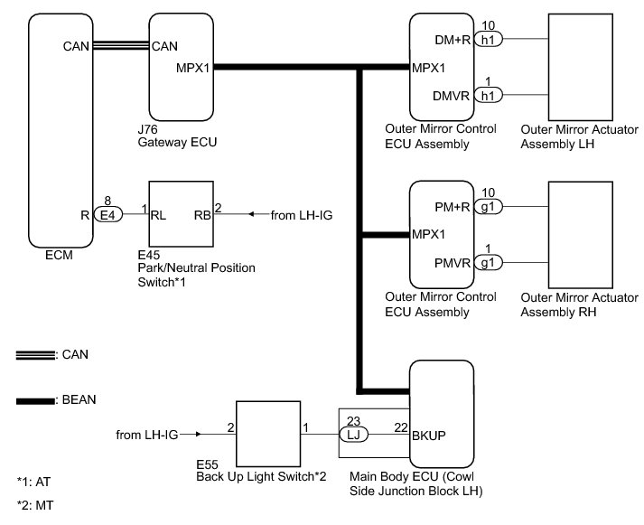 * The main body ECU (cowl side junction block LH) detects the condition of the back up light switch. The main body ECU (cowl side junction block LH) also sends a back up light switch signal to the outer mirror control ECU via the sends a back up light switch signal to the outer mirror control ECU via the BEAN communication system. The outer mirror control ECU controls the reverse shift-linked function based on the back up light switch signal.