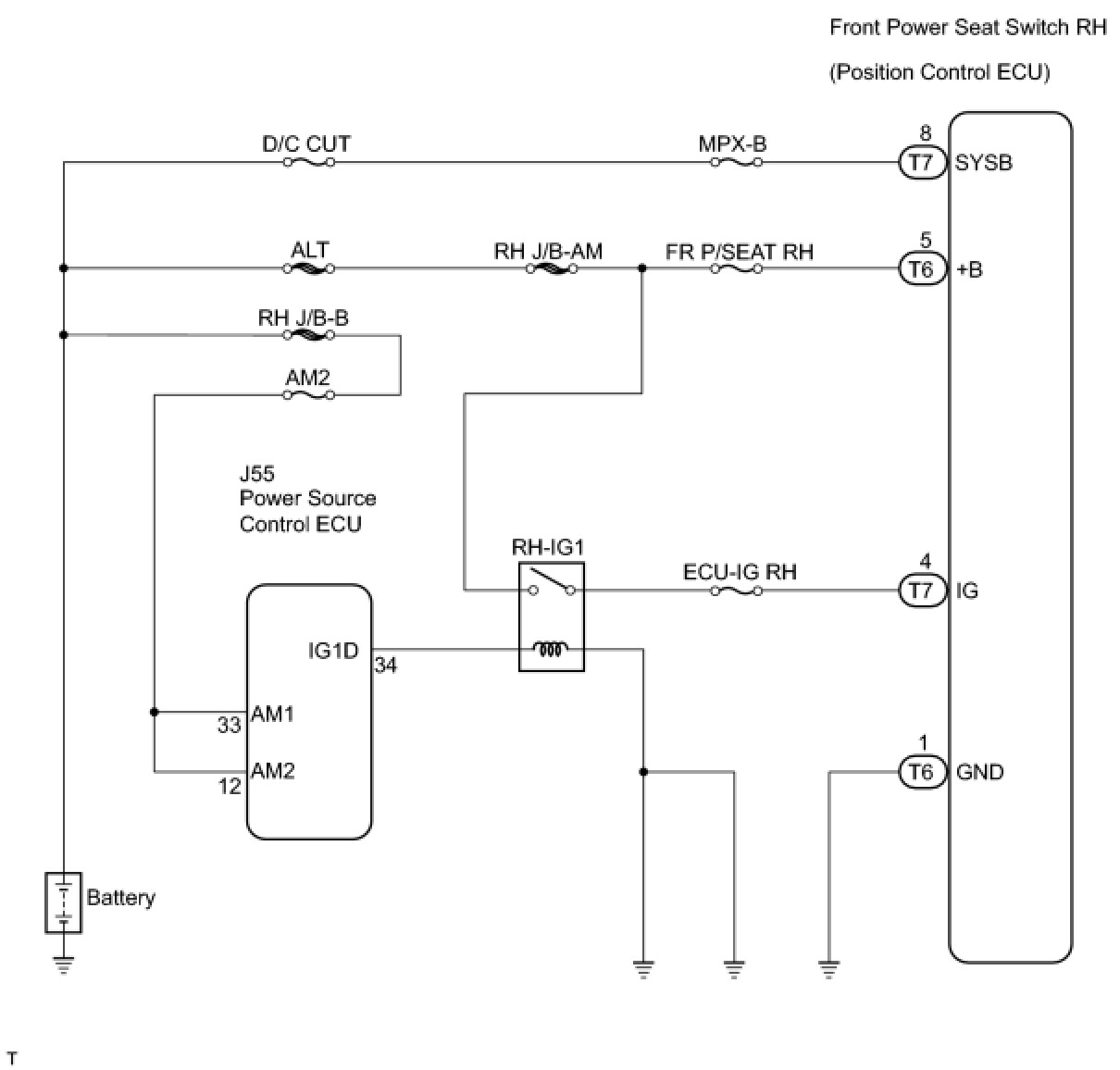 This circuit is the power source circuit for the front power seat switch RH (position control ECU).