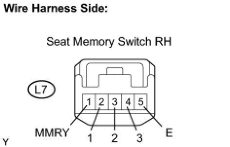 The seat memory switch RH sends signals to the front power seat witch RH (position control ECU) via the multiplex communication system to memorize a given seat position. This memory system does not use a position sensor. The seat position is detected by counting pulses that are output when the motor turns. If there is no pulse output from the motor, the motor will stop operating. The seat memory switch RH is later used to send signals to the front power seat switch RH (position control ECU) to return the seat to one of the memorized positions.