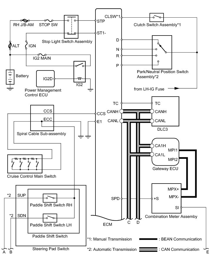 * The ECM cancels the cruise control system when the shift lever is moved from D to N or 3rd, 2nd, or 1st range is selected with the shift lever in S, and the ECM receives a park/neutral position switch signal (for Automatic Transaxle).