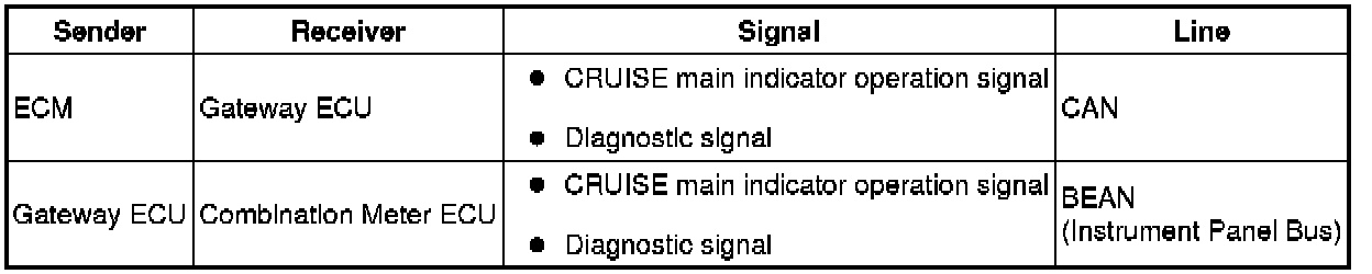 * The ECM illuminates the combination meter assembly's CRUISE main indicator light when it receives a cruise control main switch ON signal.