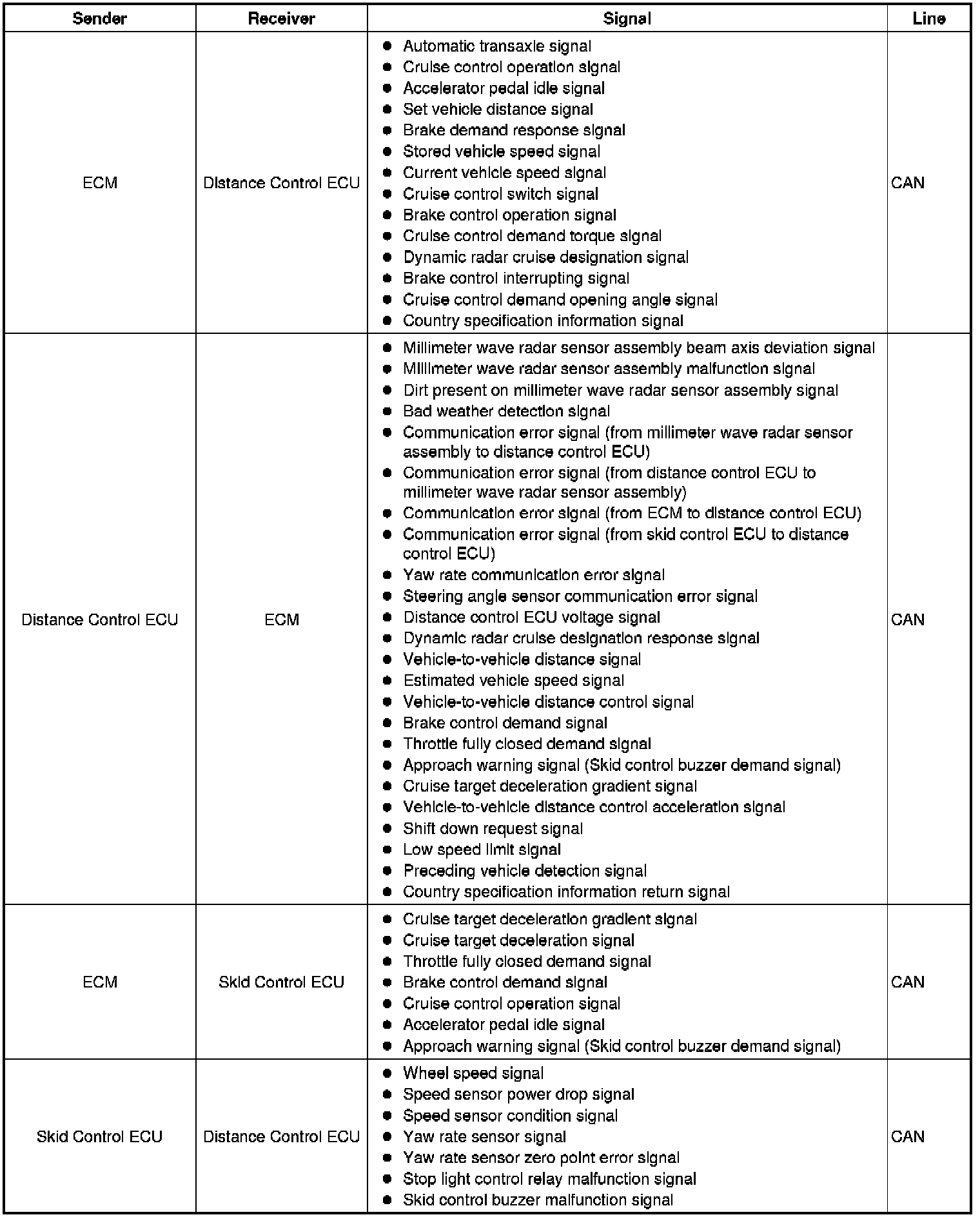 The distance control ECU determines the distance to the vehicle in front, relative speed, target decreasing speed, and deceleration rate. Based on these data, the ECU transmits a brake demand signal to the skid control ECU via the ECM.