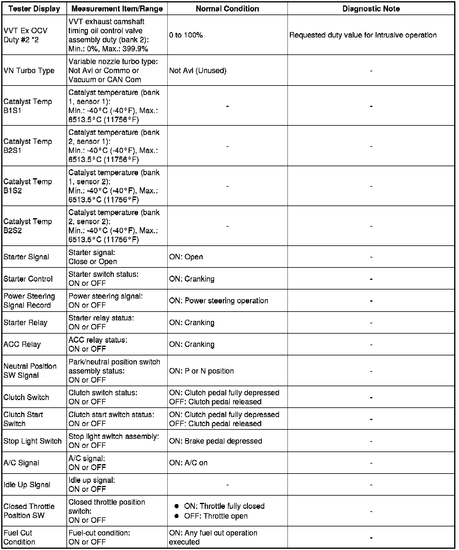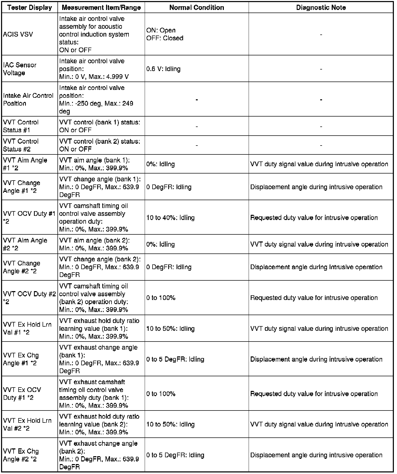 * *2: Data List values are only displayed when performing the following Active Test: Control the VVT System (Bank 1, 2), Control the VVT Linear (Bank 1, 2) and Control the VVT Exhaust Linear (Bank 1, 2). For other Active Tests, the Data List value will be 0.