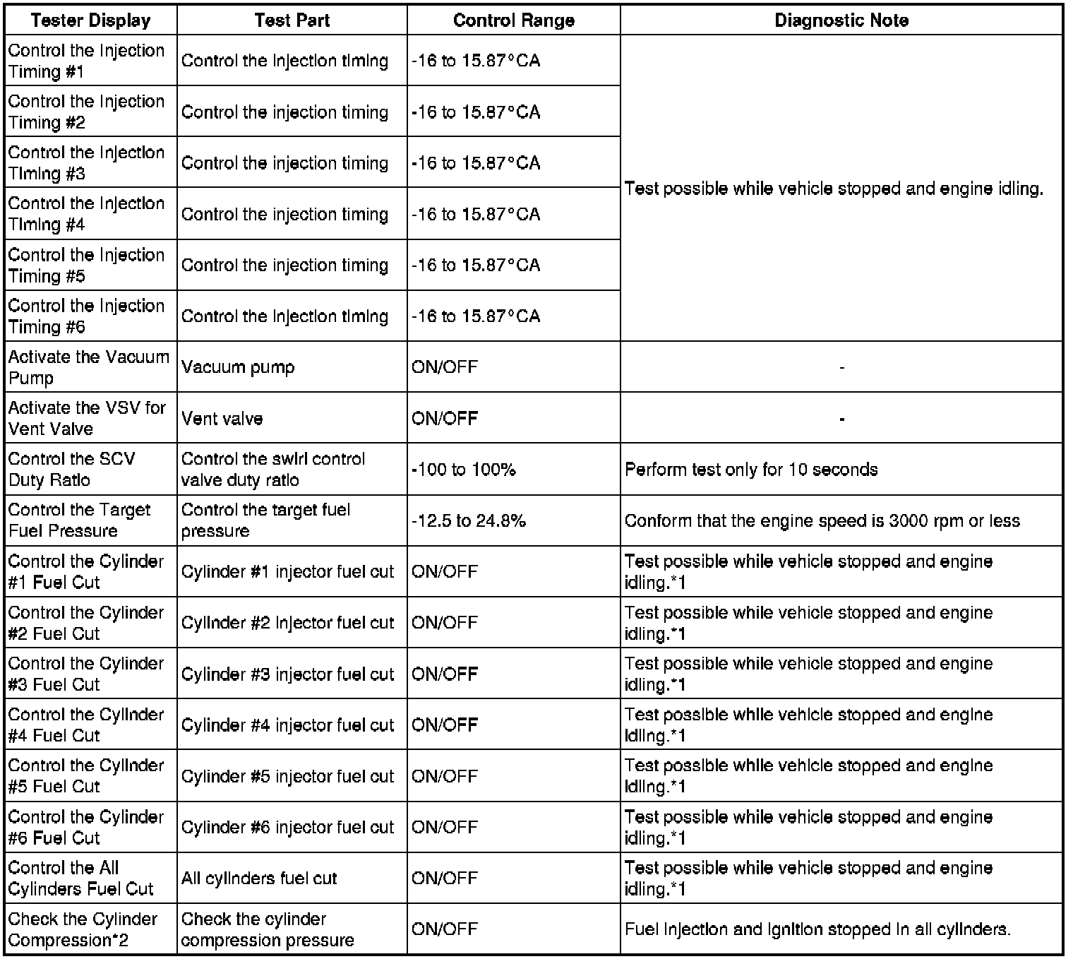 *2: While the Active Test item Check the Cylinder Compression is being performed, the fuel and ignition of all cylinders is cut. At this time, the ECM measures the speed of each cylinder while the engine is being cranked.