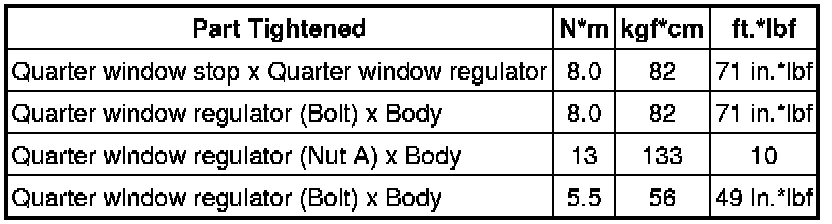 SPECIFICATIONS: WINDOW / GLASS: TORQUE SPECIFICATIONS