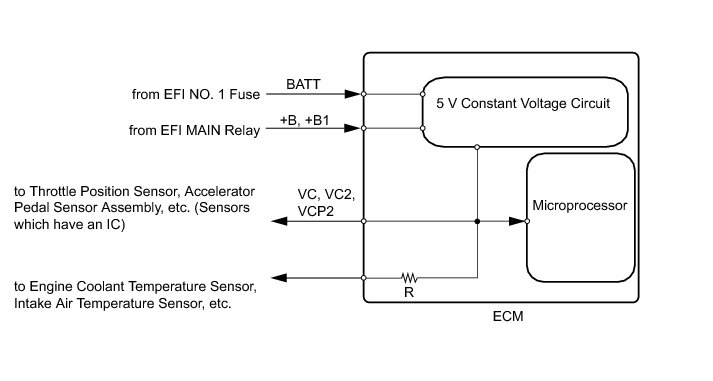 The ECM constantly uses 5 V from the battery voltages supplied to the +B (BATT) terminal to operate the microprocessor. The ECM also provides this power to the sensors through the VC output circuit.